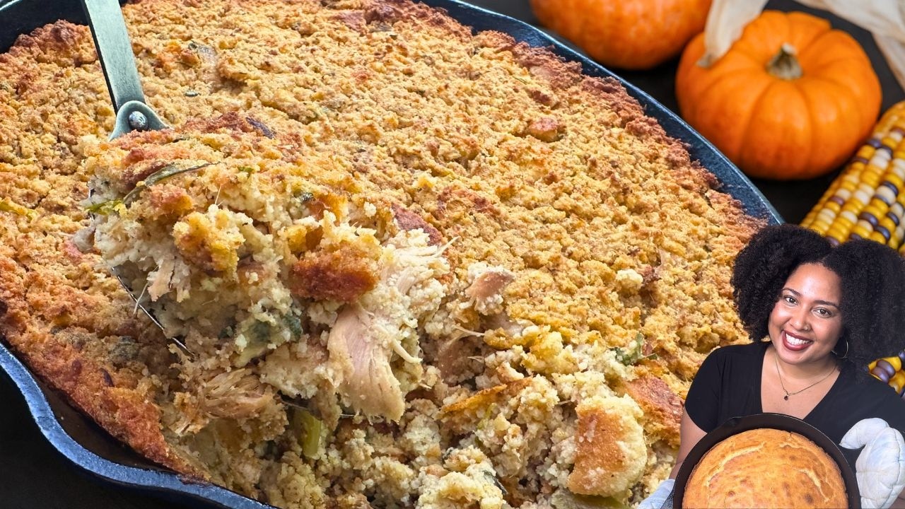 Hey y’all. Welcome to Chamira’s Kitchen. It is time for me to show you guys how I make the most delicious, flavorful southern turkey cornbread dressing. Now, if you have made any of the dressing recipes on my channel, you know that my dressings never miss. I’m also going to show you guys how to make a delicious gravy. Guys, this is going to be so good. Now, of course, cornbread dressing is going to start off with corn bread. So, I’m going to preheat the oven to 425°. Now, y’all, I like using some good old Crisco in my skillet, y’all. This is Sister Mabel. Do y’all know my cast iron skillet? Some of y’all new here don’t know Sister Mabel, but y’all going to meet her today. Okay, now I’m going to put her in the oven for, you know, while the oven is preheating. That’s going to take about 5 minutes. Now, some of y’all going to want to snatch my wig because I like to use a cornbread dressing mix for my cornbread dressing sometimes. If you want to use a completely from scratch corbett recipe, I will link one in the description that I do use for a dressing. Now, I’m using three cups of that white lily buttermilk mix. And then I’m going to add in a4 of a cup of sugar. Trust me, this is not going to be a sweet cornbread. Okay? Because actually that mix does not have sugar in it. This is just going to bring out the flavor of the corn. Here I’m adding in a half of a stick of melted butter. You can use salted or unsalted. I’m also going to add in two large eggs. Then I’m going to put in two cups of butter milk. Now, the cornbread that I make with this mix is not my preferred cornbread to eat as a side dish. It’s not nasty, but it’s definitely not better than homemade, nor is it as good as my doctorred up Jiffy recipe. So, I only use this cornbread just for dressing. Then, I’m going to put in three tablespoons of vegetable oil. I like to add in a little bit of that vegetable oil just because it helps with any potential dryness cuz it’s a liquid fat. At this point, Sister Mabel is piping and she is ready. Okay, so I’m going to pour in all of my cornbread mix. And you’re automatically going to see a crust start to form. Place this back in the oven. And you’re going to cook at 425 degrees for about 20 to maybe 30 minutes. Mine is usually ready right at the 25 minute mark. You see the top is brown. It’s perfectly cooked. And you want this to set out at least one night, but sometimes I even make this 3 days in advance so it is extra stale. What I am going to do for my turkey is that I’m also going to be cooking my turkey in advance. If you’re doing this for a holiday, of course, you probably are going to be cooking your turkey the day you’re going to prepare your dressing. You can use any seasonings you want. This is what I’m using, but what’s important is that you need to pick a seasoning blend that is going to pair well with your dressing. Whatever you do, you’re going to get that flavor in the dressing because you’re going to be adding some of the meat and the broth. So, this is not the time to pull out your jerk or the barbecue wings. That’s a very specific flavor that doesn’t match dressing. But I feel like a simple blend of herbs, chicken bullion, seasoning, salt, garlic, onion, paprika, that’s a classic pairing that works. You could throw in a little bit occasion. You know, not too much, but a little bit will work fine unless you want a very Cajunforward dressing. I’m going to prepare turkey wings, which is my favorite cut of the turkey in a crock pot overnight. And I’m going to use the celery, the onion, and the carrot, as well as some whole garlic cloves to pack a bunch of flavor into the broth. You need that broth to taste good because that is really going to be the flavor powerhouse of your dressing. So, I’m also using fresh herbs, a bay leaf, and you definitely want to leave on the wing tips of the turkey wing. First of all, I like to eat them, but secondly, they have a lot of collagen and there’s a lot of bone, and that bone is going to flavor the broth. This may seem like a lot of seasonings for this amount of meat, but actually it is going to be perfect because remember, we’re going to put in water and some of that seasoning is just going to fall off into the broth. And you still want that broth to have a lot of flavor as well as getting that seasoning down into the bone, okay, of this meat. You could also use another cut of turkey if you want to. And you also don’t have to prepare your wings in a crock pot. You could boil them on the stove with the same seasonings and vegetables until they’re soft, or you can cook them in the oven covered. But whatever you do, you’re going to have to get at least 5 to six cups of broth out of this thing. So, I am going to add about 2 and 1/2 cups of water. And then the turkey is going to release the rest of the water. I’m going to put on my lid, and I’m going to cook this low and slow. I’m just going to cook this overnight for 8 hours. Using a crock pot is an excellent way to free up the stove, especially when you have other dishes that you are going to be cooking, especially if this is a holiday. So, I like to just keep it simple. And I also like just having some things prepared in advance. Now, it’s the next day and this is the turkey wings. Now, these are actually delicious just to eat on their own. I am going to be eating two of them and then using two of them for the dressing. You can use three or all four of the turkey wings for the dressing if you want. It honestly just depends on how meaty you want your dressing to be, but today I’m only going to use two. And the ones that I’m going to eat, I’m going to broil them with a little bit of butter just to brown up the skin. I’m going to remove the vegetables, but I’m not going to throw them away. I’m going to be adding the celery bits and the onion bits to the dressing, but I will not be adding th