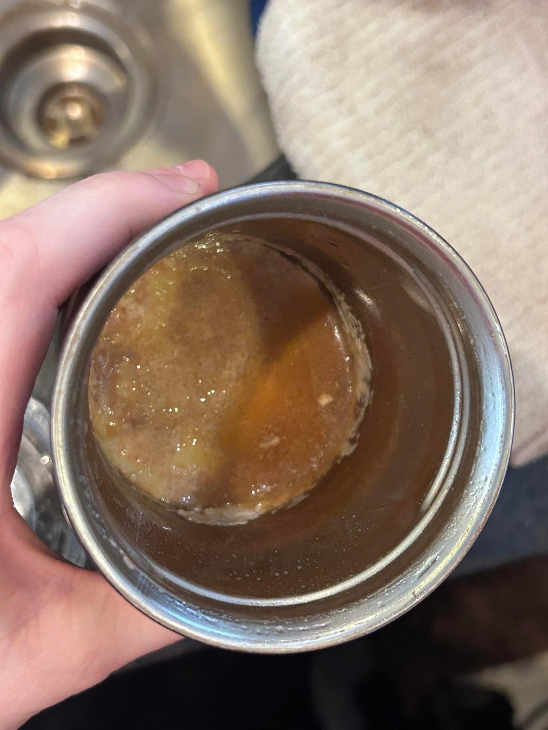 This dude asks me to make his drink in his personal cup, always gives me the lid still screwed on, I refused to make it today because of this monstrosity. I was almost gagging. That is a solid layer of milk and coffee scum with rancid liquid underneath. Made his order in a Togo cup and he took his personal cup, dumped it in the trash can, STILL asked me to rinse it out, and then asked me to also rinse the lid with hot water as well to “keep it from getting bacteria”. How entitled do you have to be to have working people be your dishwashers??
