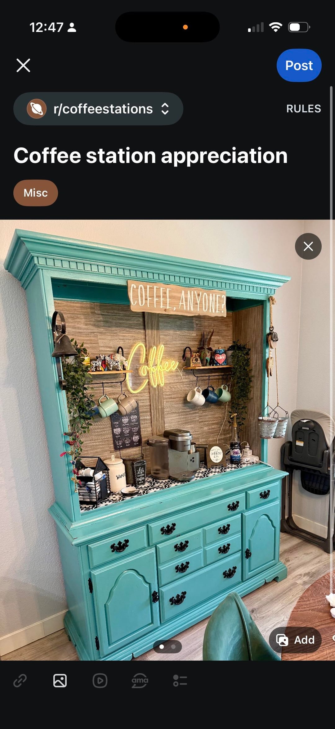 Every detail is her design, from the faux greenery to the little hanging buckets and the fun "Coffee, Anyone?" sign. It's the new centerpiece of our home and the envy of every coffee lover who visits.