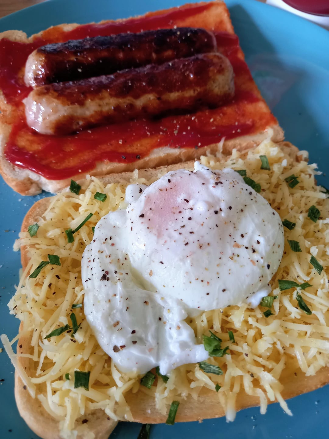 Simple Pork Chipolatas & Poached Egg Sarnie, Extra Mature Cheddar, Chives, Pink Himalayan Sea Salt & Mixed Peppercorns