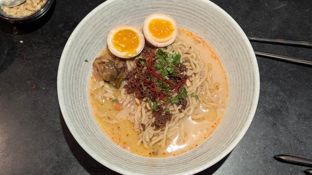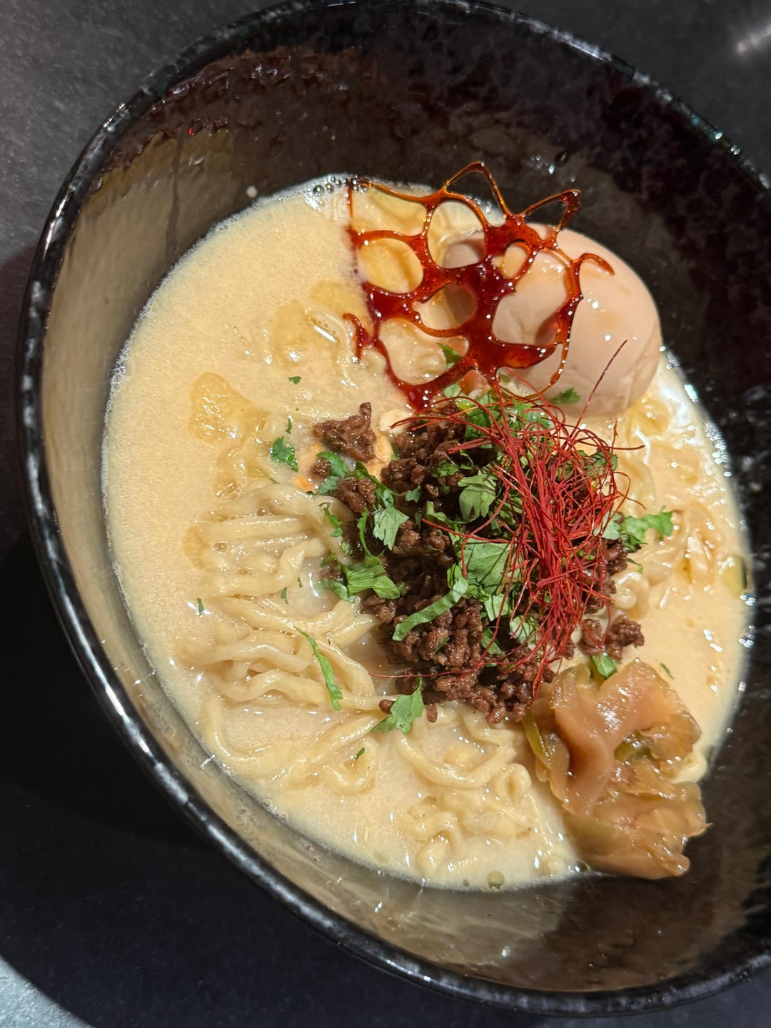 Coriander, roasted cashews, chili threads, minced beef in black bean and sake sauce, pickled mustard greens, ajitama, and a burnt caramel flower.