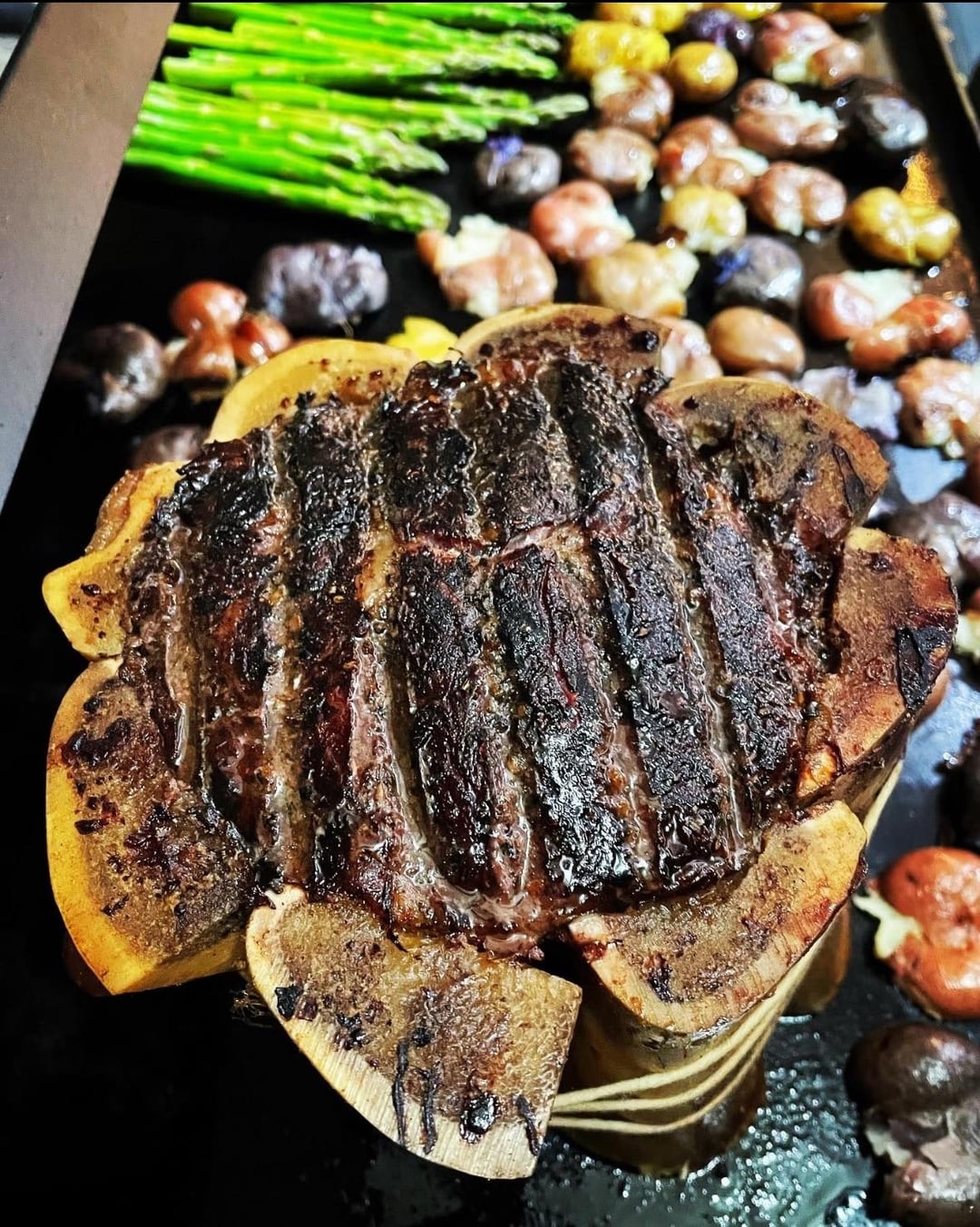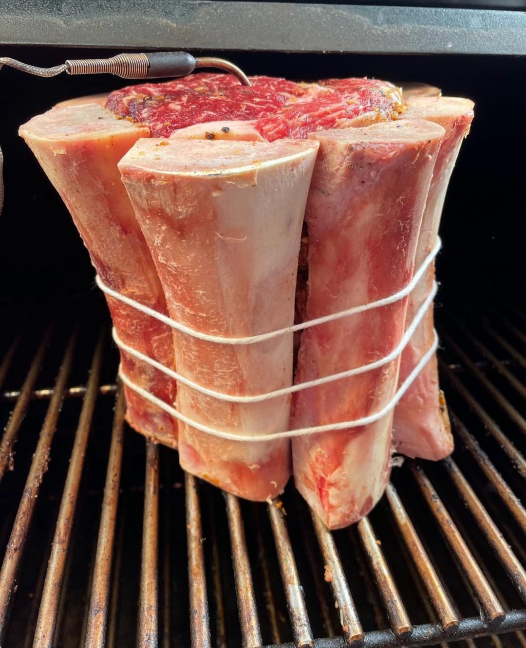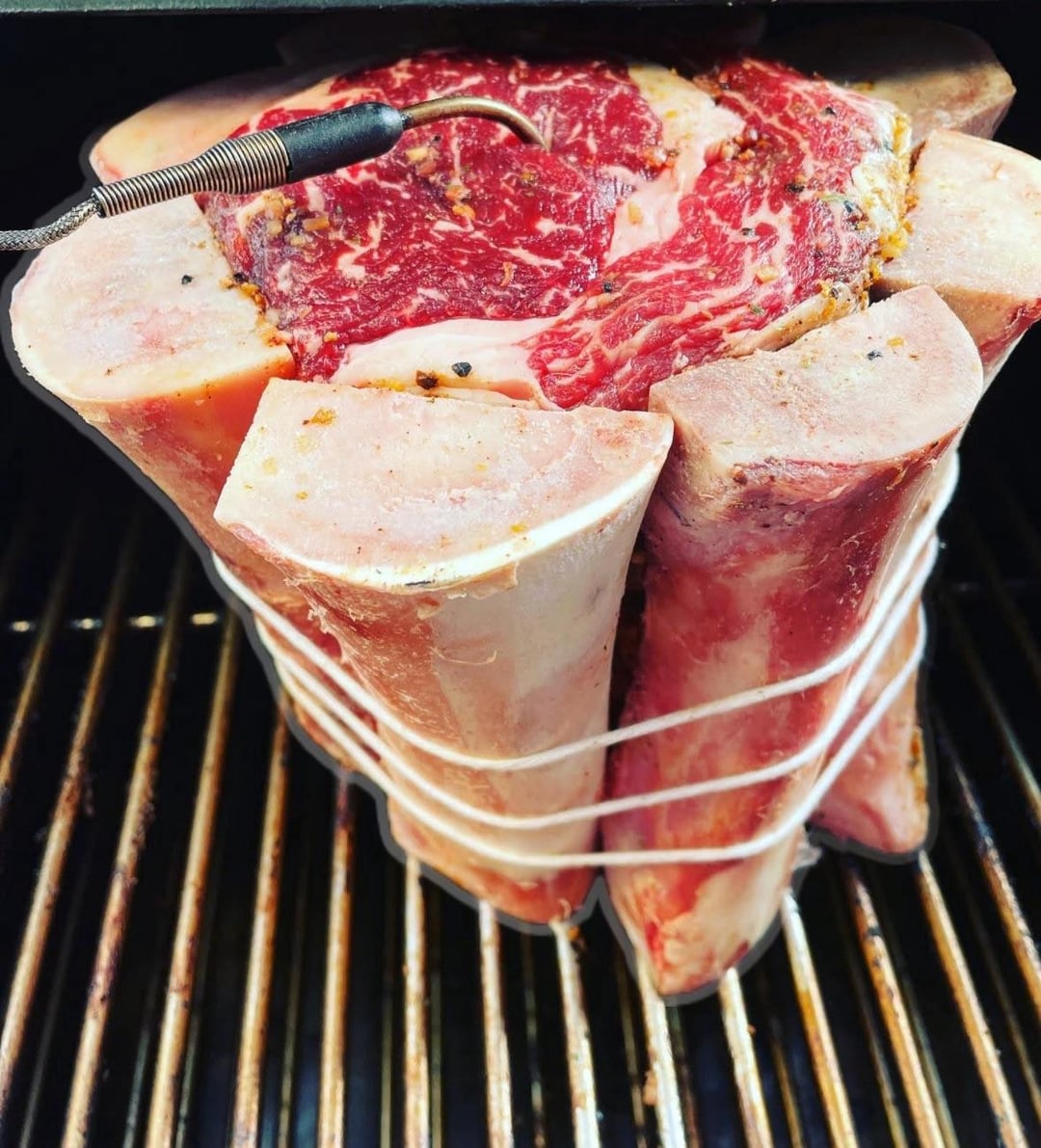 Smoked this bad boy on my Timberline 850 over cherry and oak to 130 then seared off on the blackstone. Fun to make and take pictures of. It tasted delicious, too. Be sure to catch the drippings of the marrow and baste as your heart desires. Also good to have a loaf of crusty bread rubbed with garlic on hand to dip into the marrow reserves while it’s cooking.