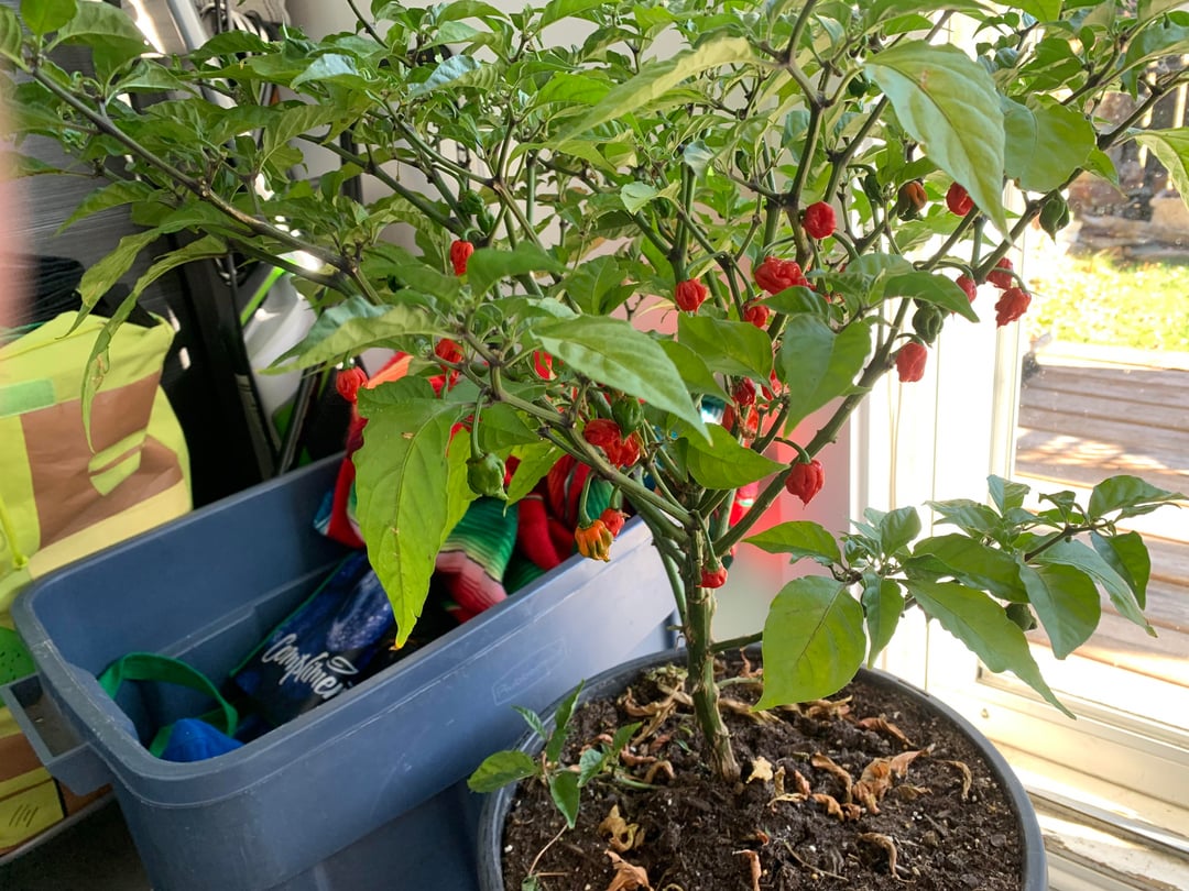 Since its inception a pot and should be brought indoors before it freezes… harvest as you need them. Or if you want to push for more chilis over winter harvest all those red chilis now and preserve what you aren’t going to consume right away.