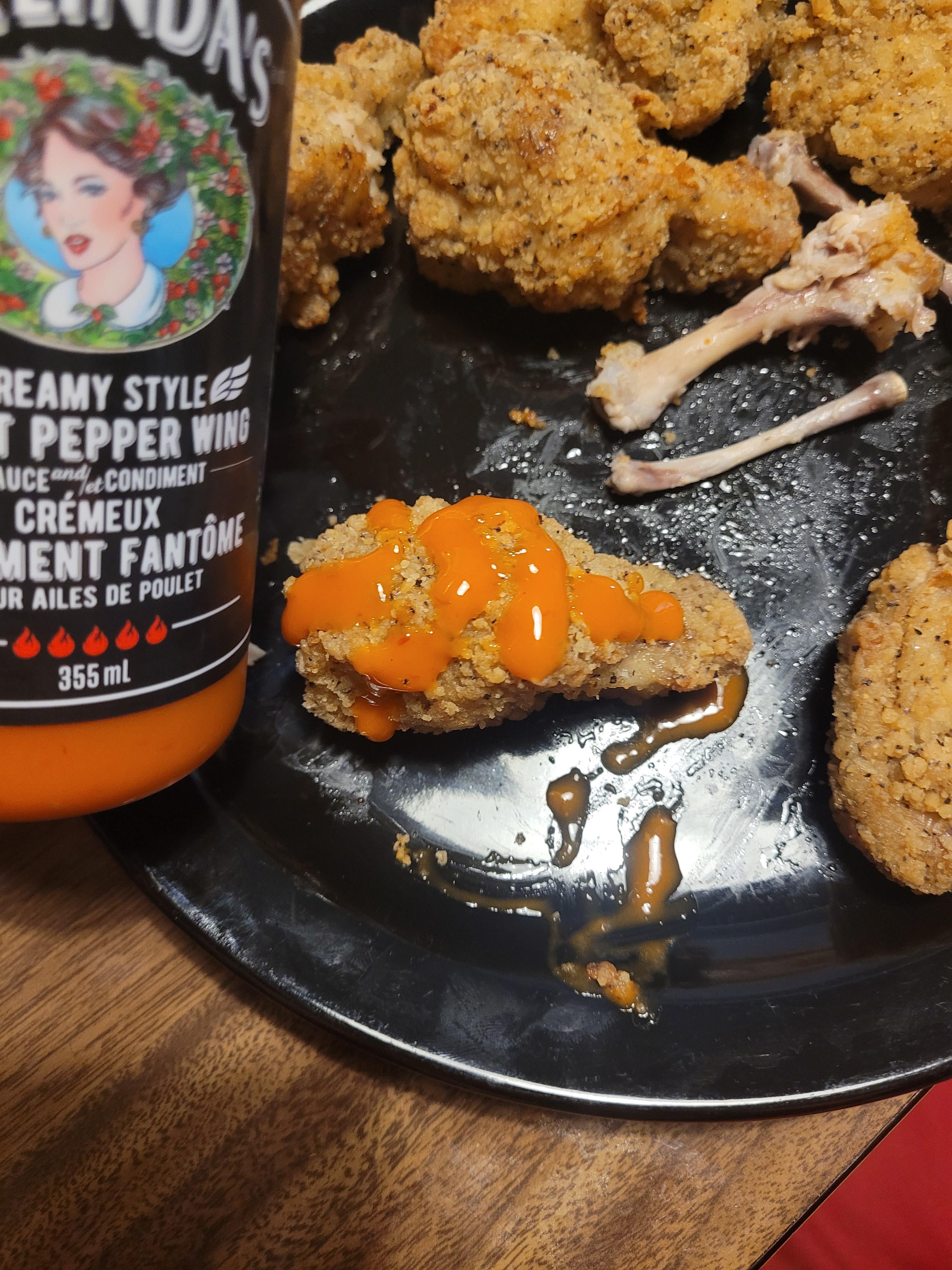 Melinda’s ghost pepper wing sauce on my chicken, and I am not being shy with the application