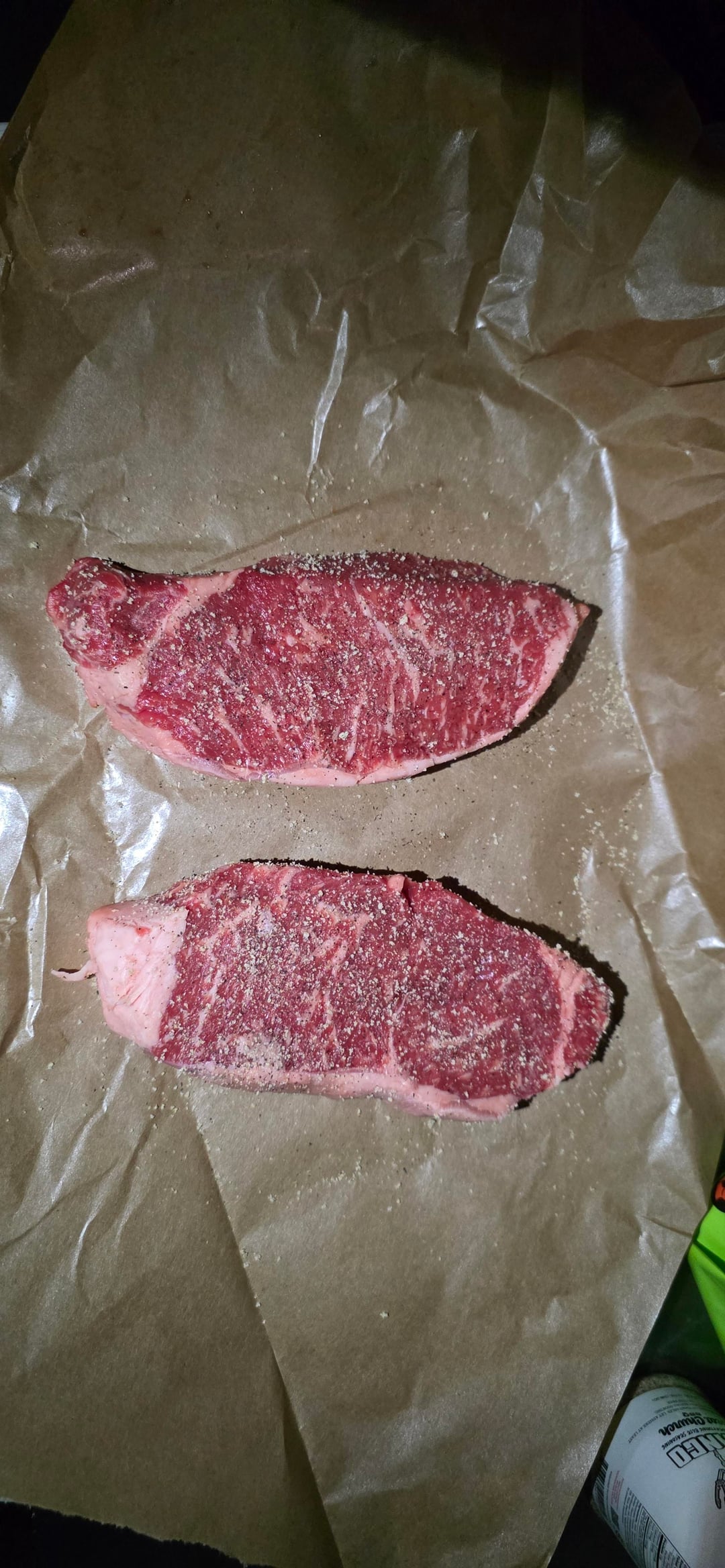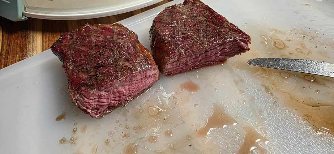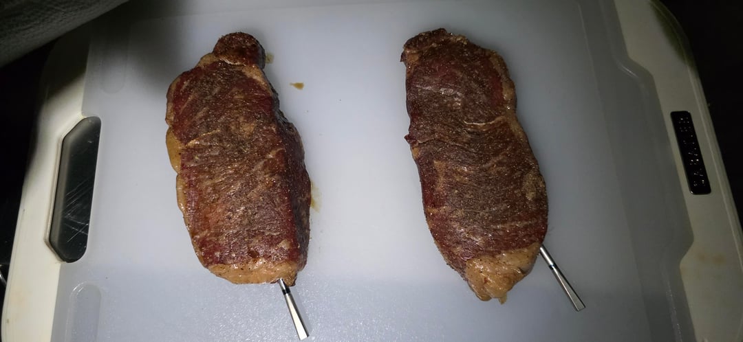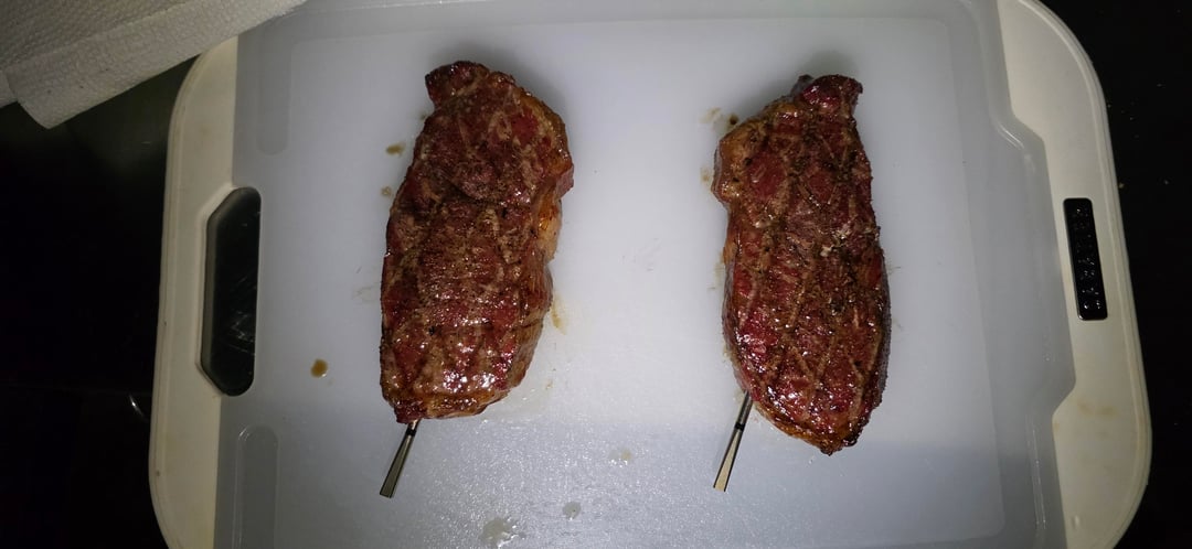 Picked up a couple of New York Strip steaks. Seasoned lightly with Meat Church Blanco. Put them on the Traeger at 225⁰ using Smokin' Pecan pellets. Plan was to pull them at 120⁰. One got there first, so ended up with one at 125⁰ and the other at 120⁰ when I pulled them. Cranked the Traeger up to 500⁰, then put them back on, pressing them down for a few seconds with my hand. Flipped at 2½ minutes, then did another 2½ minutes. According to the Meater graphs, one got to 139⁰, and the other got to 137⁰. A little more done that I was hoping for, but they were pretty damn good.