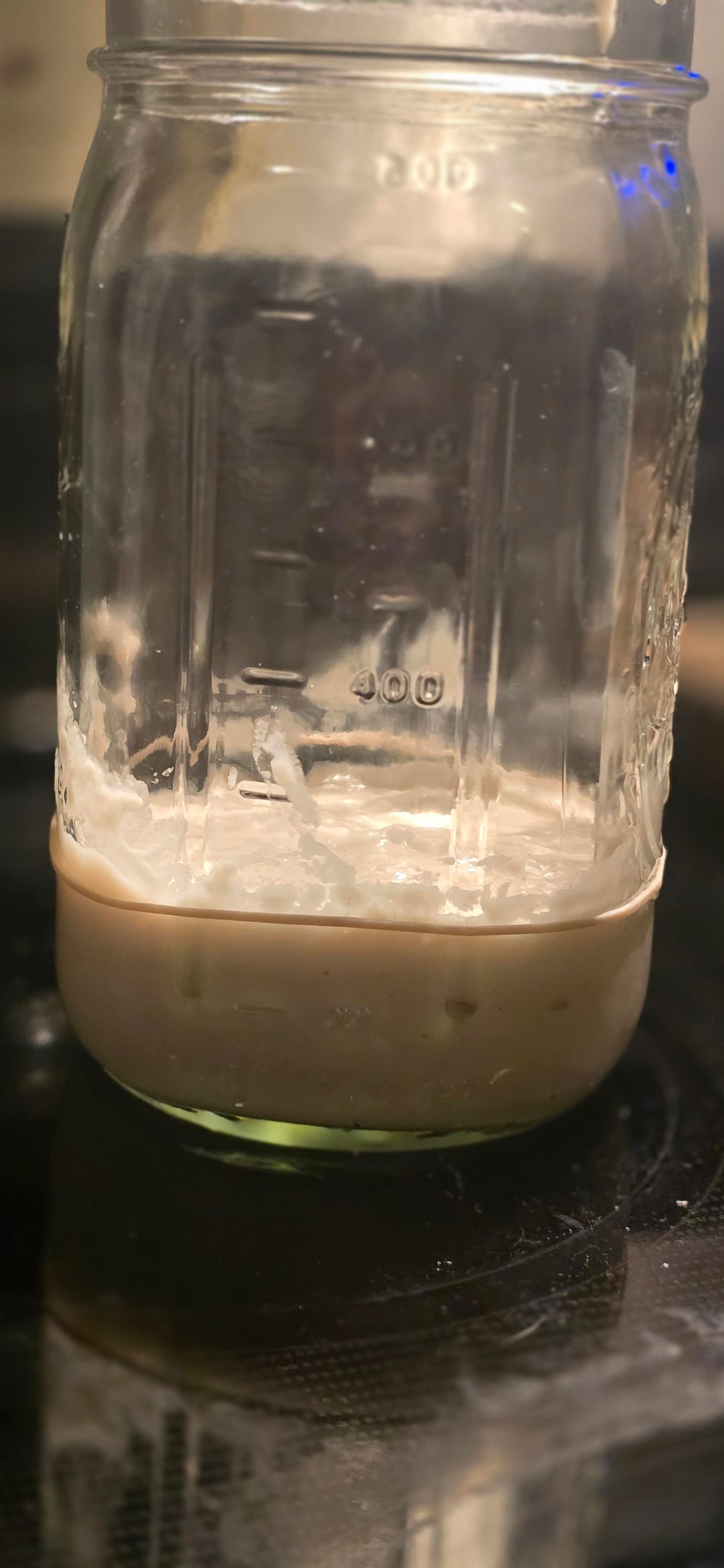 After about a day, dump out most of it. Keep about what you see now, feed and repeat. You can keep it instead of discard it – which is why they call it discard. You keep that in an airtight jar in the fridge until you need it.