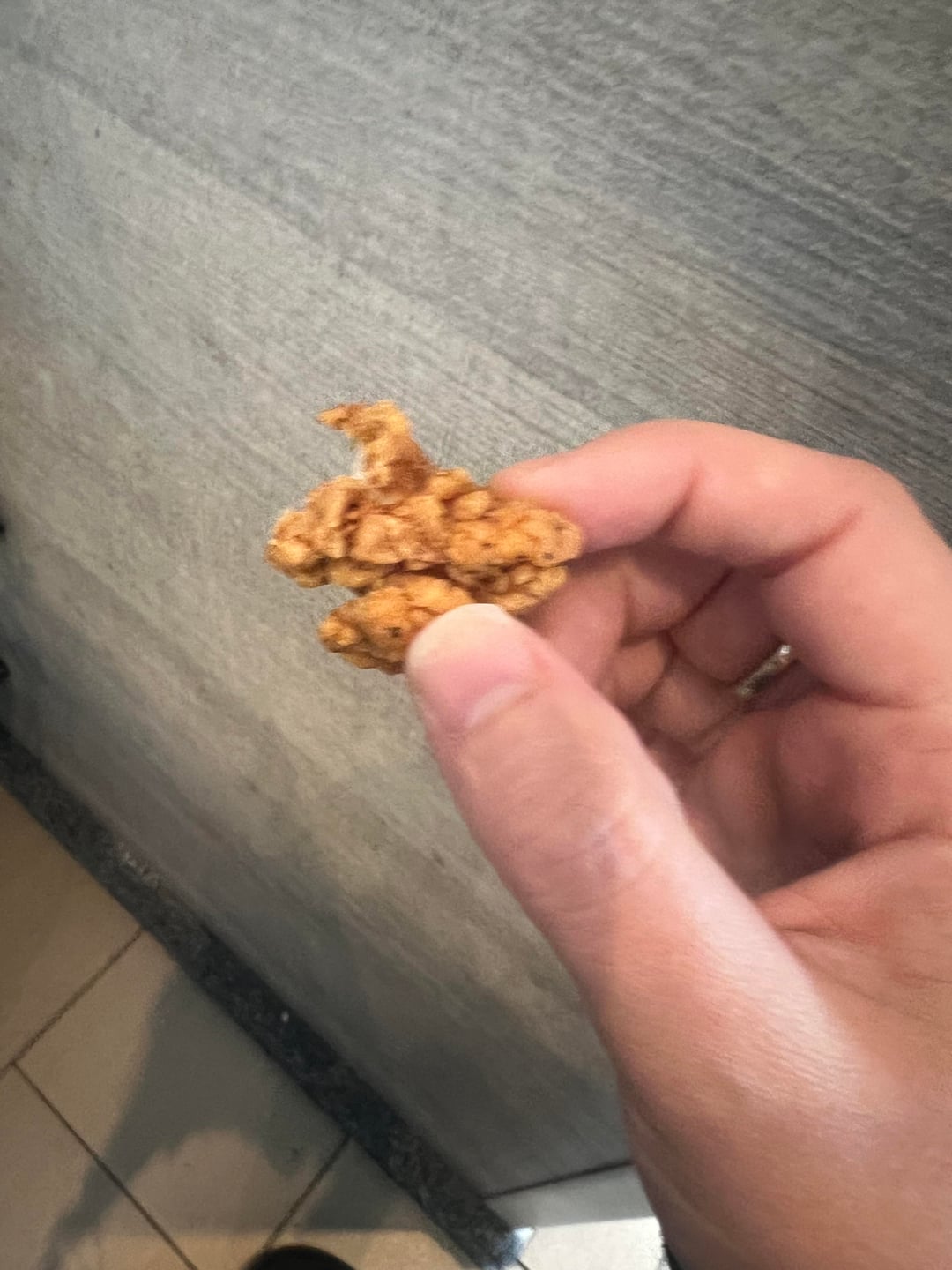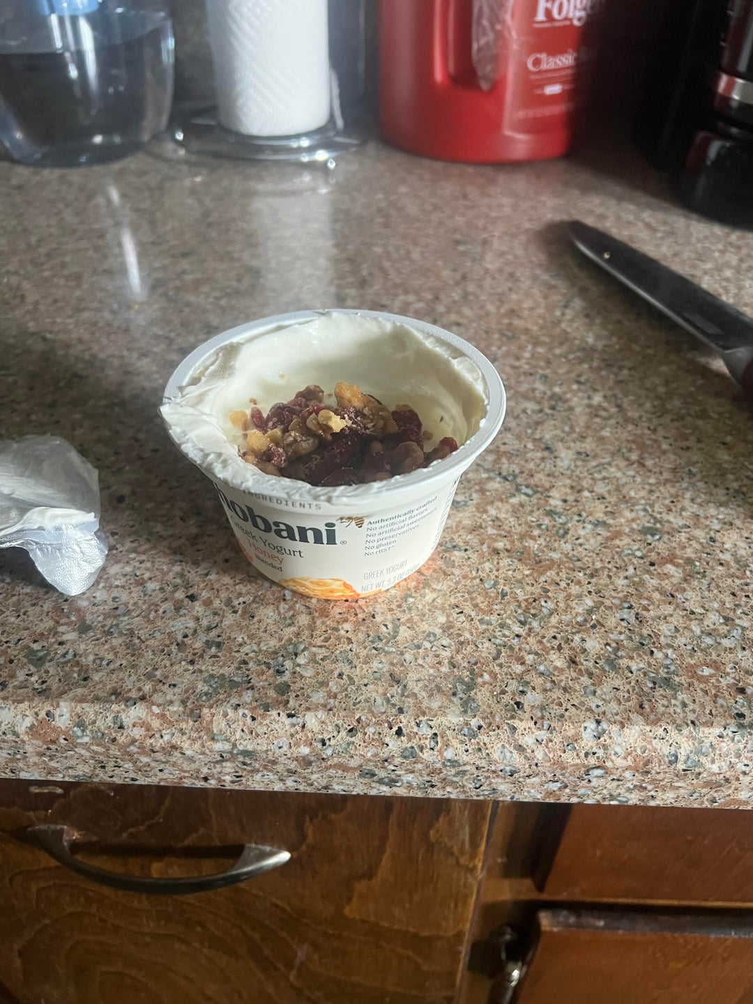 Snack/dessert: chobani honey Greek yogurt with cranberry walnut topping + baby chicken tender (couldn’t resist and it was practically a nugget) 268 cal