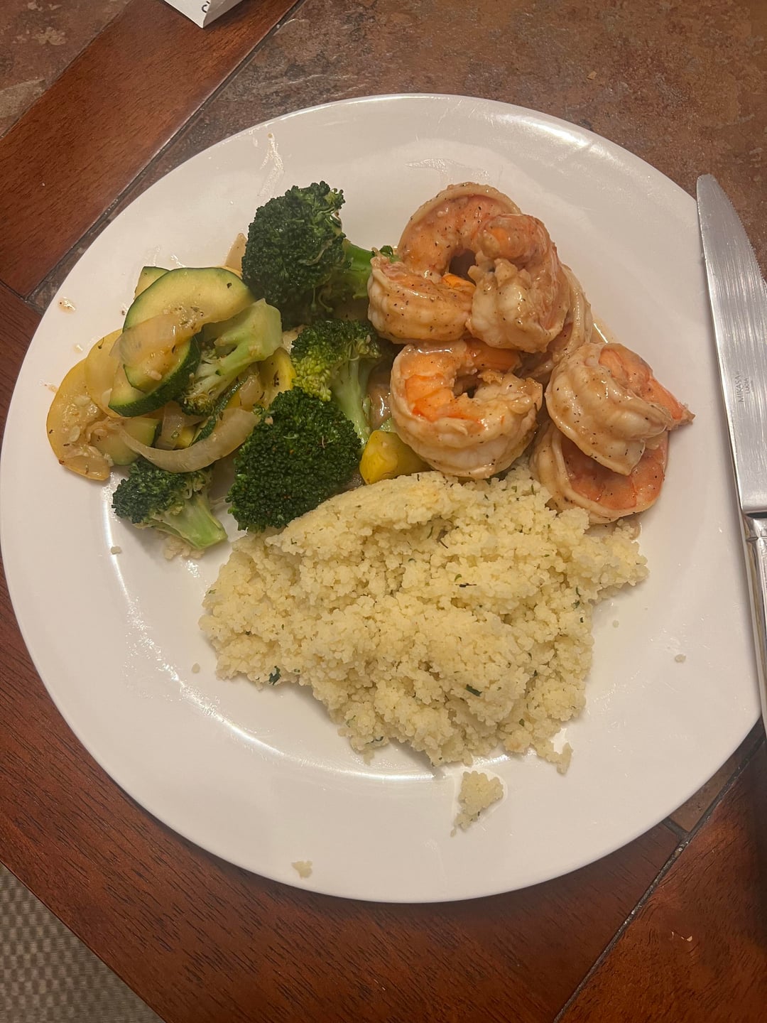 Dinner: large shrimp, zucchini, squash, broccoli onion medley, and couscous, which I didn’t eat all of. 759 cal