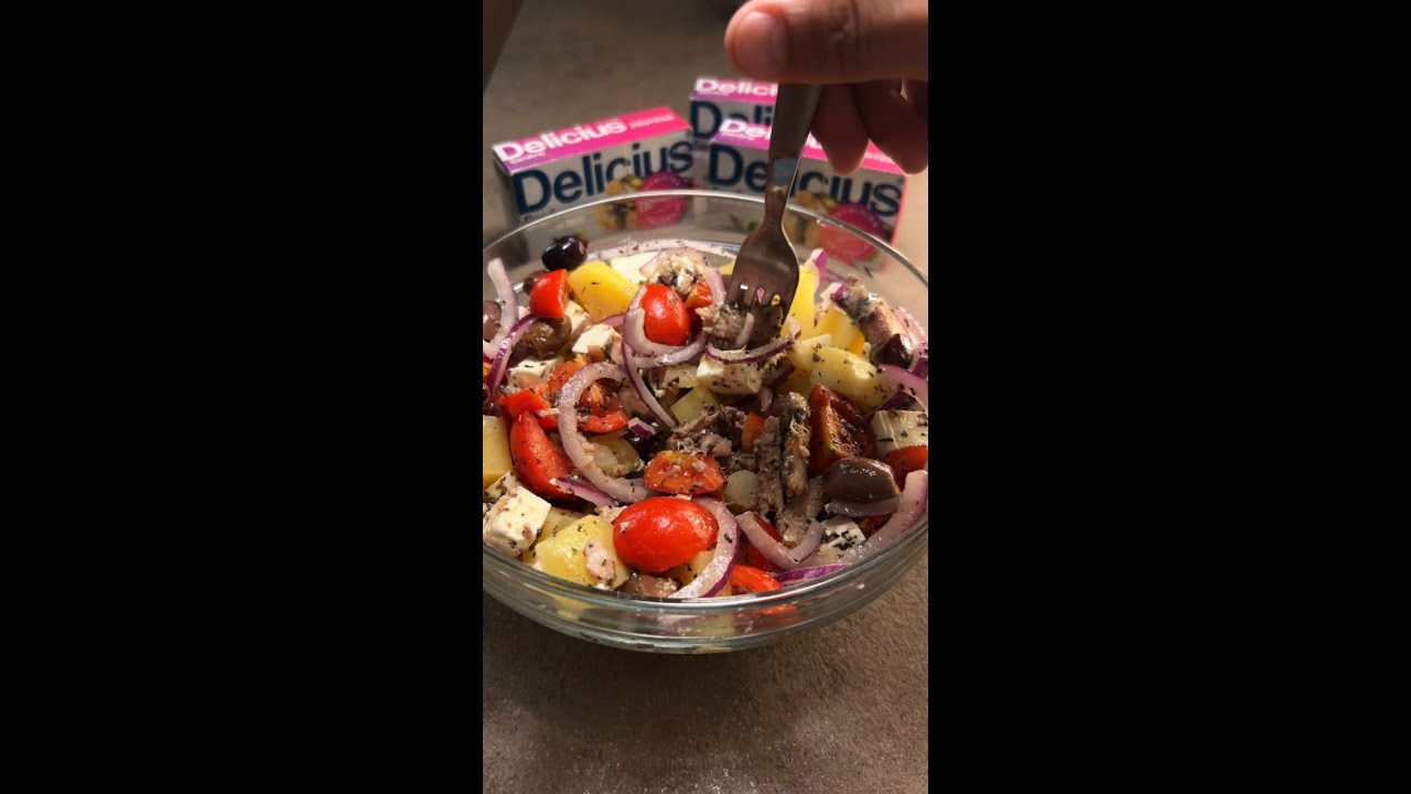 5️⃣ In una ciotola unire patate, pomodori, cipolla, olive, feta e sardine.