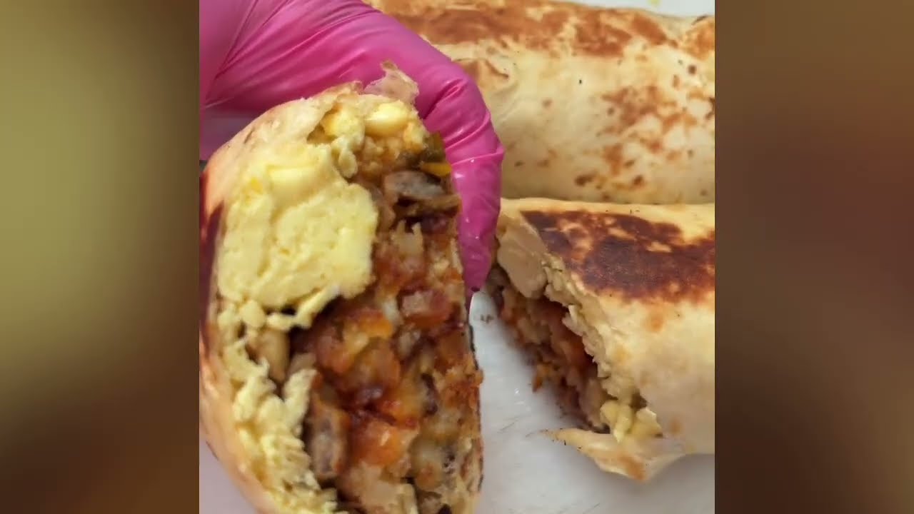 Let me show you how to make an easy cost effective breakfast burrito. You can always substitute to make it cheaper. Use a different protein. Make homemade flour tortilla. But altogether I spent less than $15. Seasoning and oil included. To begin, we’re going to dice up bell pepper, onion, and sausage. You can use whatever oil. I use vegetable oil. And then I seasoned with taco seasoning. We add it to the side. And we add our hash brown. We want crispy hash browns for our burrito. While that’s cooking, I’m going to make a quick Kool-Aid for my babies for when they get home. These are delicious and sugar-free. Now that we’ve cooked everything, our sausage, hash brown, or eggs, we’re going to heat up our flour tortilla just a bit and then we assemble. So, I’m going to do mayo. You add to your desire. I’m going to add the egg, the sausage, bell pepper, and onion. And then we add our crispy hash browns. And then your choice of sauce. I’m doing Sriracha. You can always add avocado or your choice of cheese. Once we wrap it up, then we are going to heat in a skillet just to seal the ends. Super delicious, simple, and it keeps his belly full. And a cold drink.
