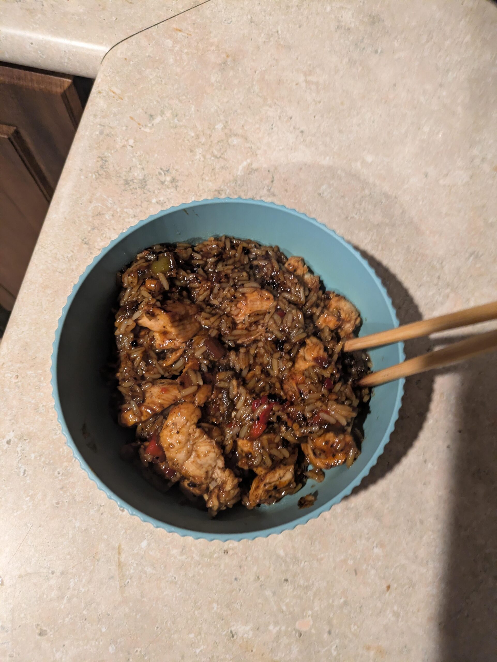 Frozen chicken, frozen onion and pepper mix, instant rice all cooked in sweet chilli, soy and Worcestershire sauce.