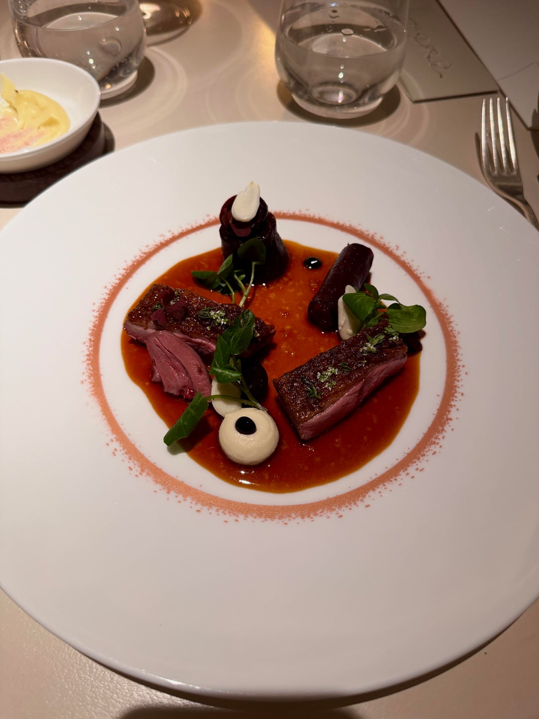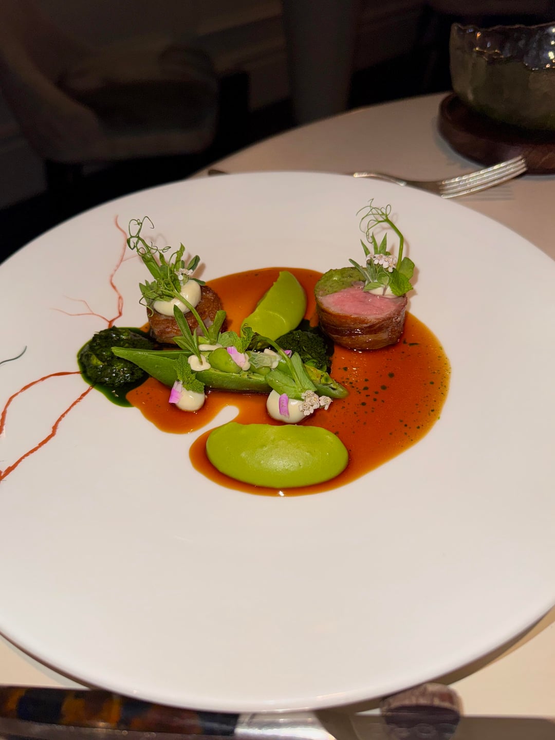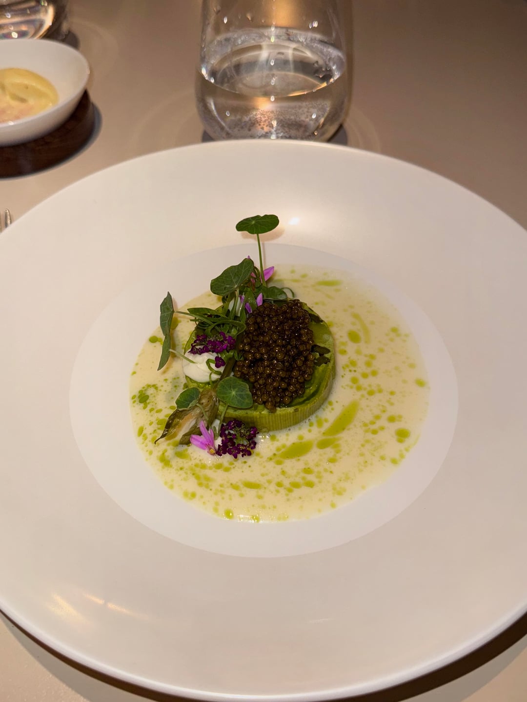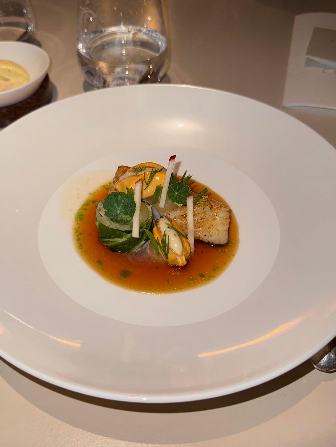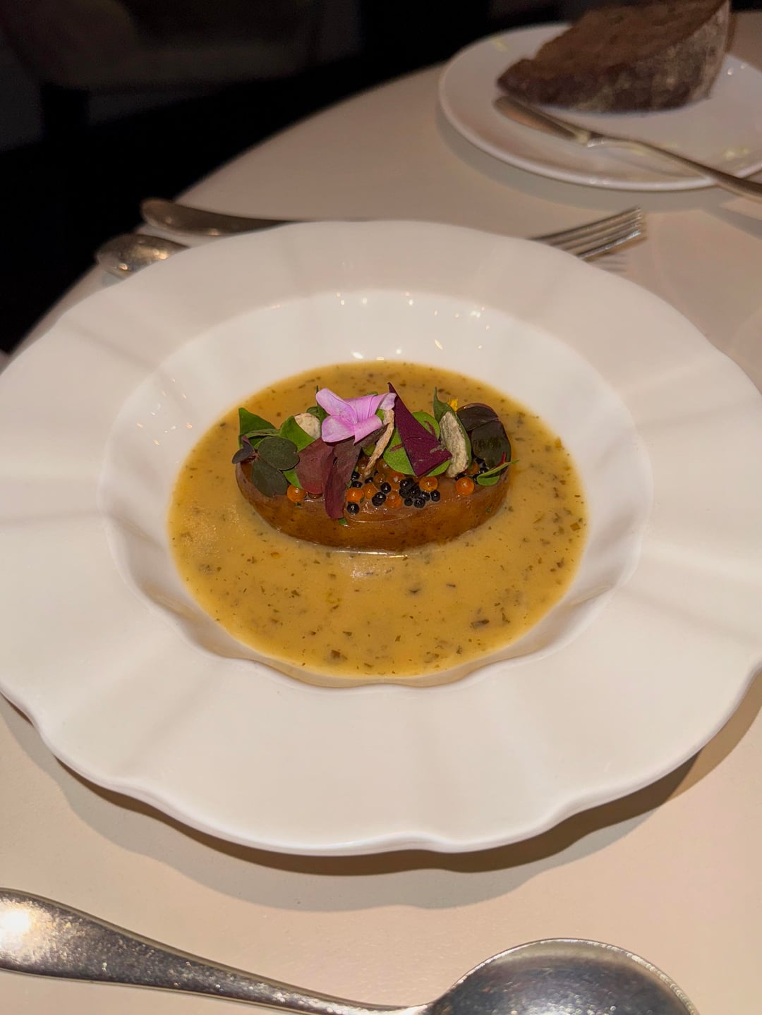 Every dish was beautifully presented, but not every bite was memorable. The butter was nicely salted, but the bread was cold. The cocktails were good. I went with the seasonal menu, which turned out to be way too heavy on vegetables (it didn’t really wow me). My partner went with the classic menu. The only dish I genuinely loved was the potato and roe (classic) – it was simple but really good. The leek and potato dish (seasonal), even with a big spoon of caviar, just didn’t land. And getting served basically raw stuffed tomato (seasonal) definitely threw me off, though I tried to appreciate it for the “experience.”