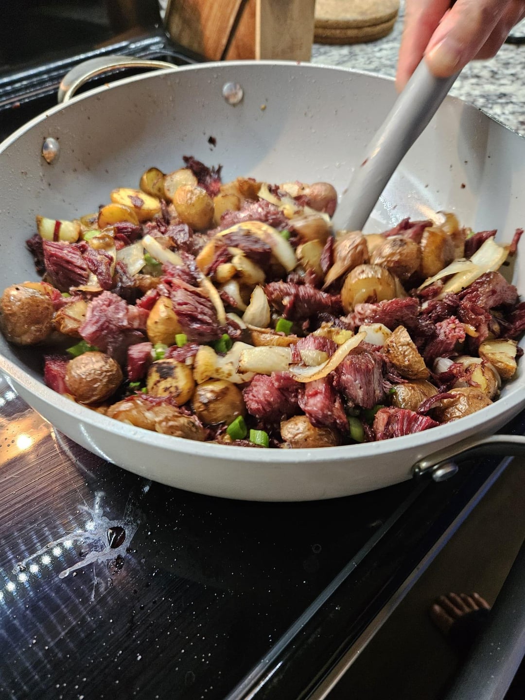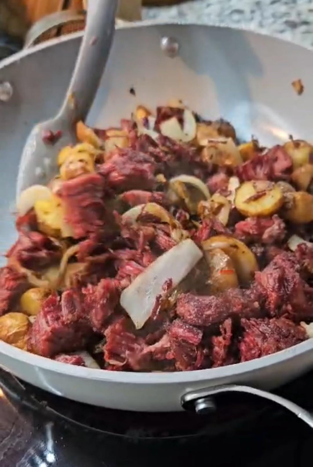 Sauté and meld: the beef gets tossed in with the potatoes and onions, picking up all the caramelized bits.