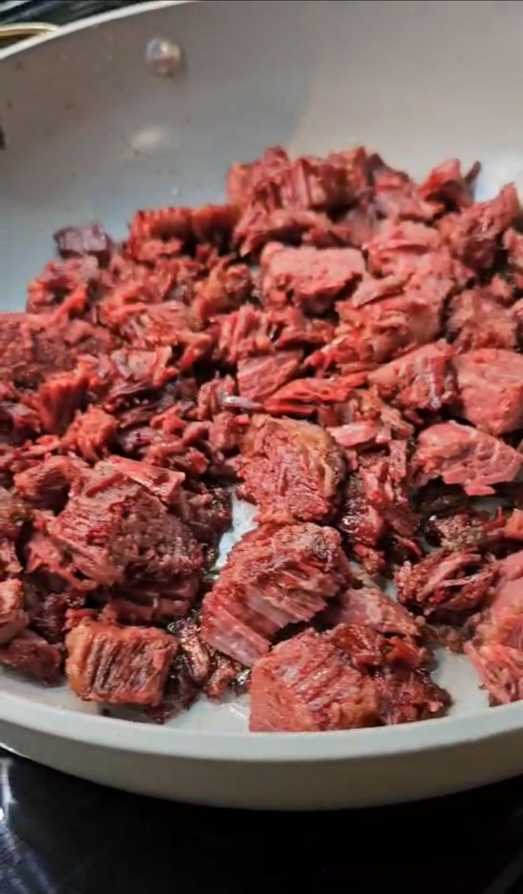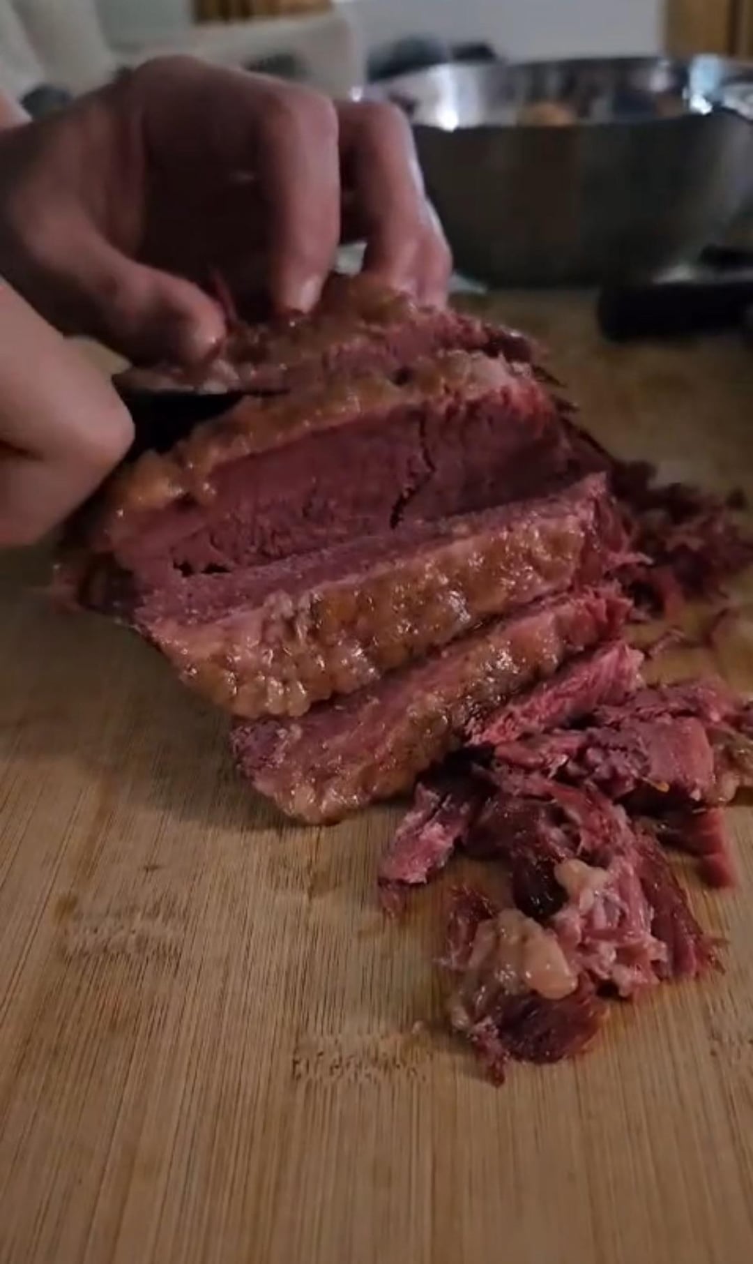 Corned beef brisket: slow-cooked until tender, then chopped into thick, juicy chunks. The deep rosy color comes from the curing salt used in traditional corned beef.