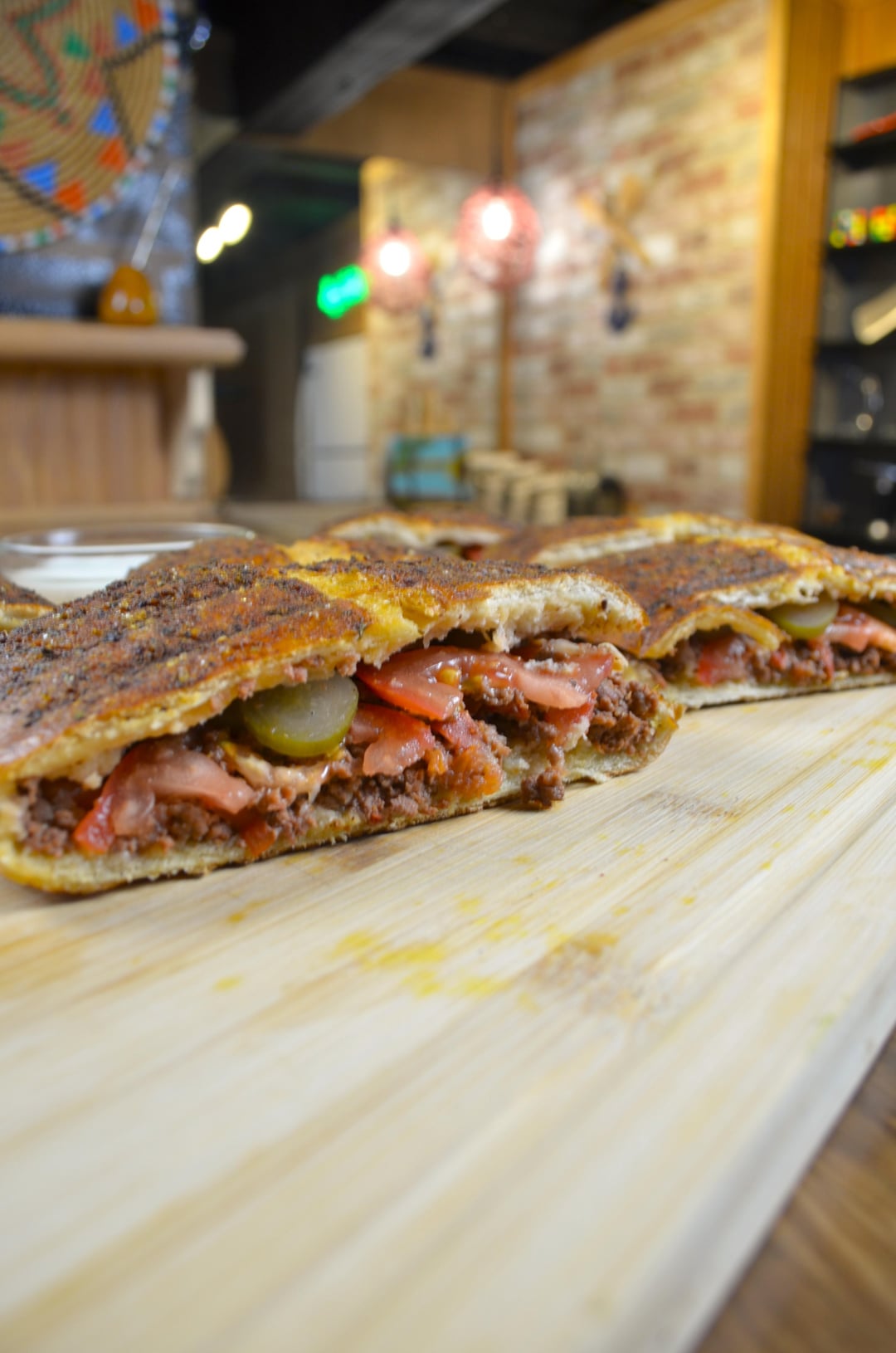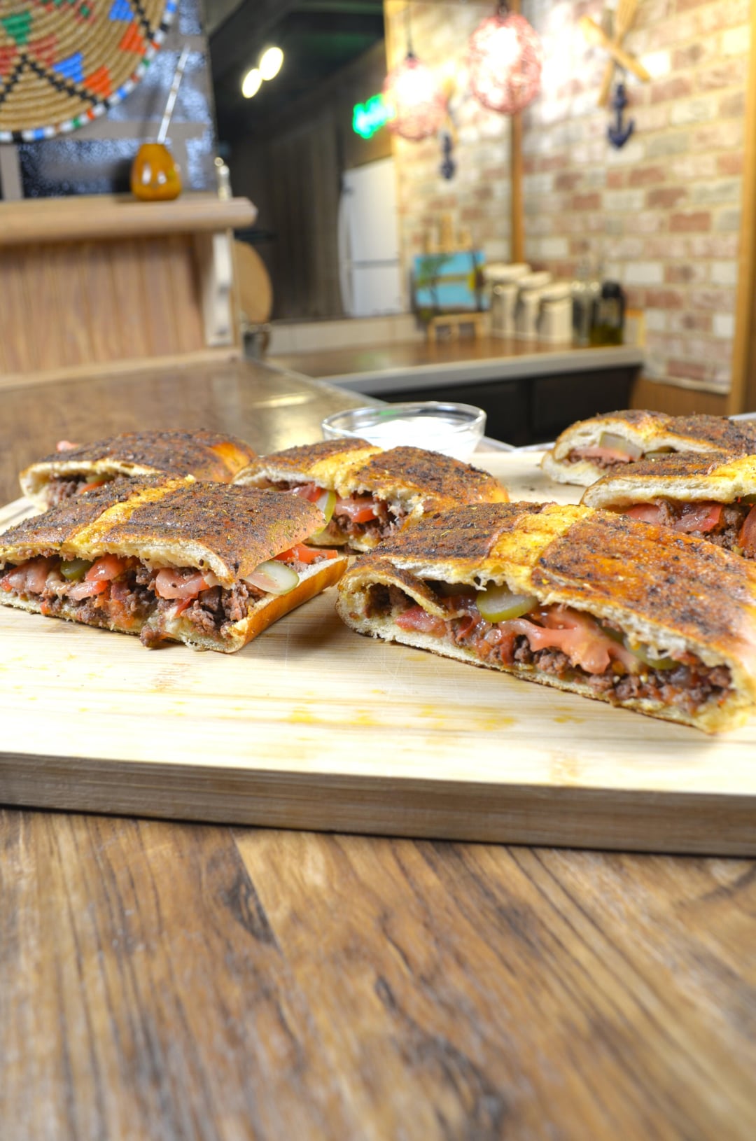 5. Slice open the garlic & herbs Italian bread loaf, fill it generously with the cooked sojok mixture, and close it up.