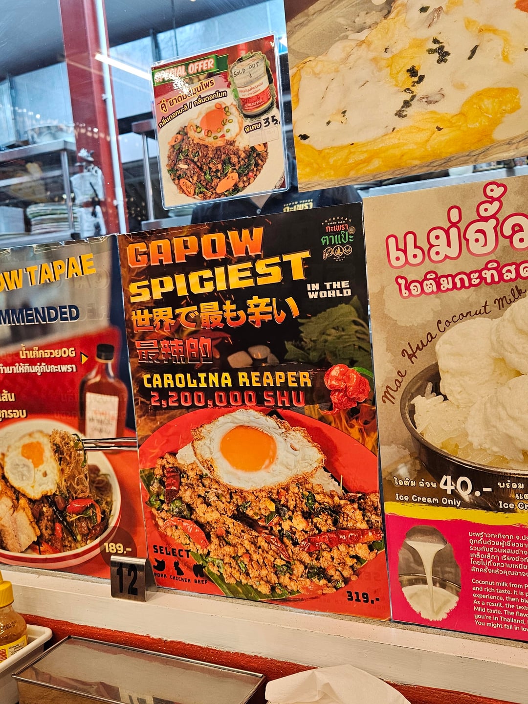 Now I am not complaining because the Gaprao is delicious. However the more I travel the more I realized that when it comes to truly, really, super spicy food, the place to find it is really the US. I mean they are advertising using Carolina reaper, famously developed by Ed Curie in south Carolina. When you think about it it's really not that surprising, despite the common perception.