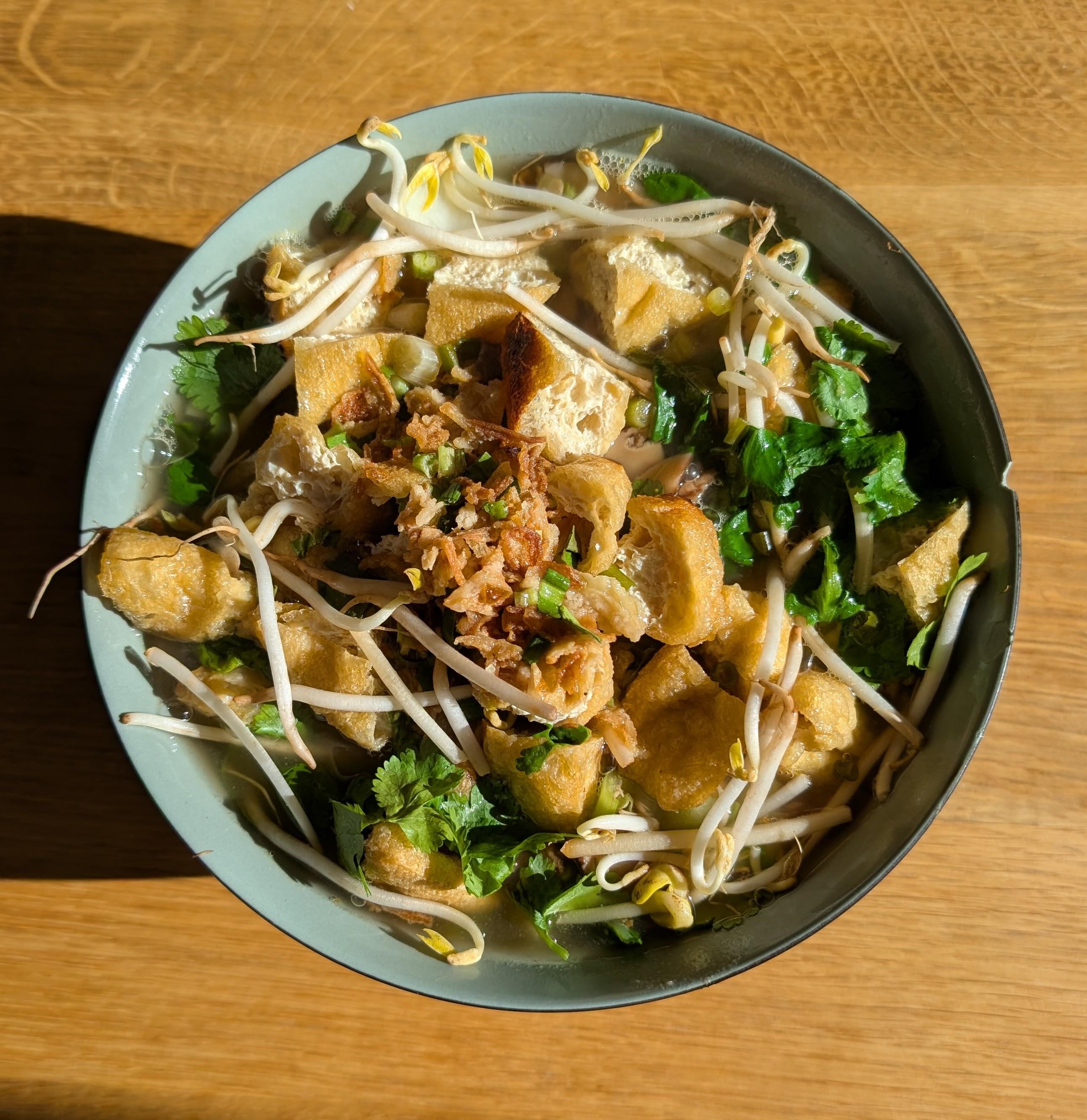 Vegetable broth, rice noodles, lime, tofu puffs, Pak Choi, shiitake, bean sprouts, cilantro, fried onions. I'm in heaven.by fugsgotnerfed 2 Comments Mr_Stranger_King 1 month ago looks good. Fuzzy_Welcome8348 1 month ago Looks great!