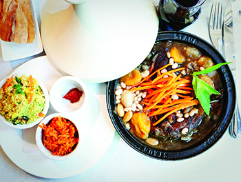 You’ll find Morocco in the accents at Tagine Restaurant & Wine Bar in Croton-on-Hudson in the floor tiles at the entrance to the restaurant and some plates hung on the wall. But virtually everything else about the French-Moroccan bistro’s design and decor—the deep-red seating; the small, almost cramped, paper-lined tables; and the wine bottles turned water pitchers—is French.