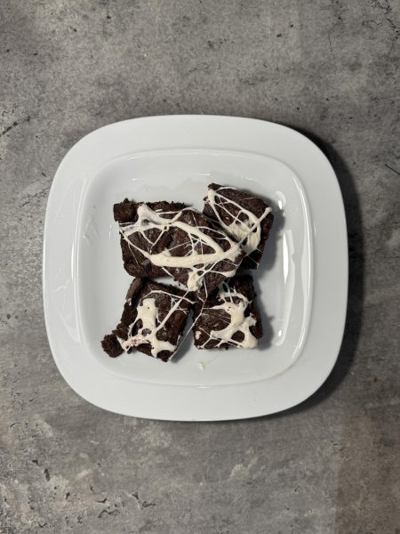 Spooky spider web brownies rest on a plate. (Emily Chung)