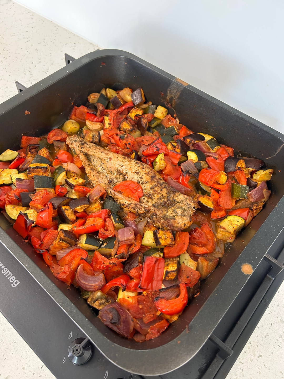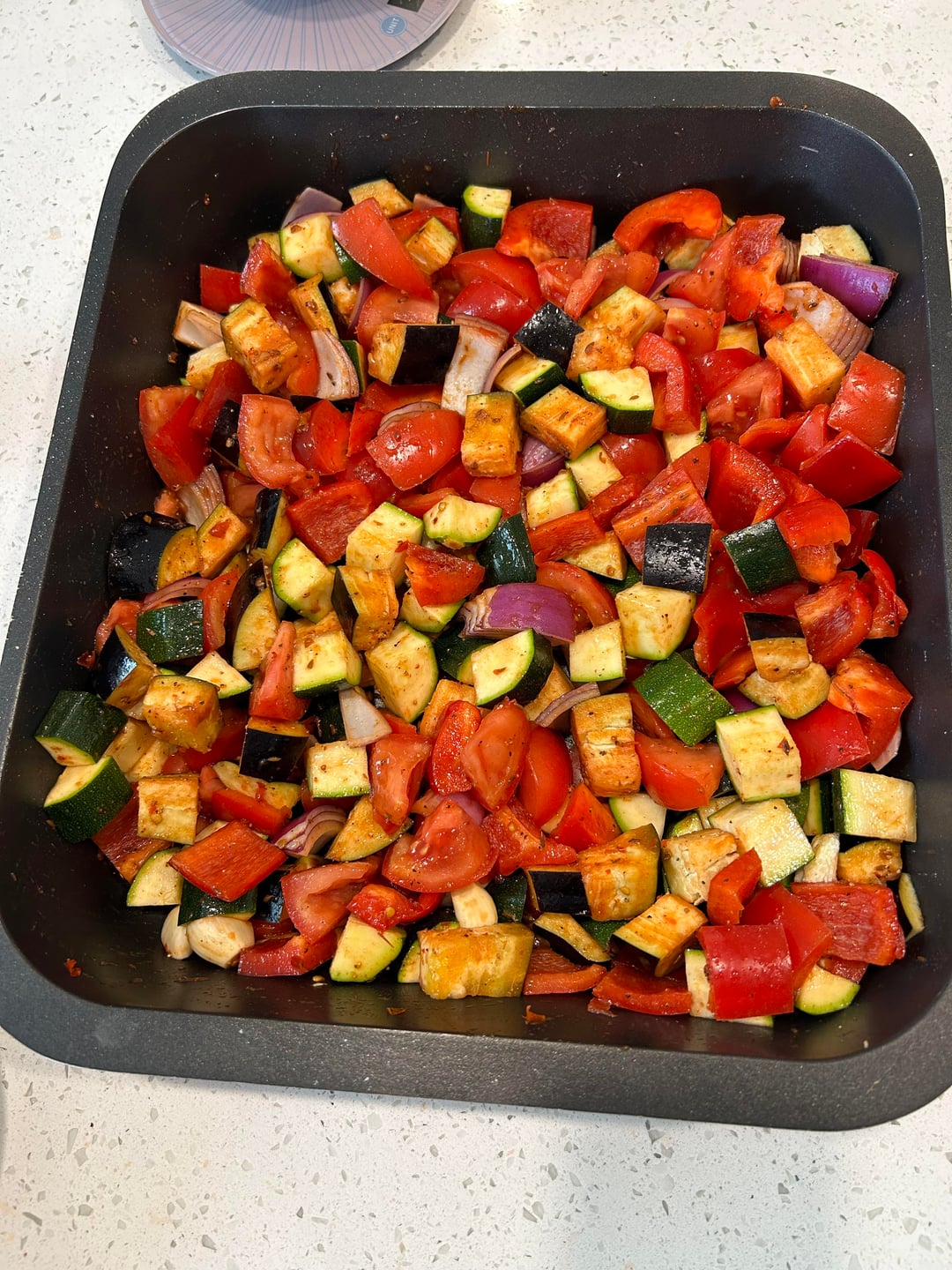 Chop the eggplant, zucchini, peppers, tomatoes, and onion into large chunks and spread onto a large roasting dish along with the garlic cloves. Season with harissa, 1/2 tbsp oil, and salt and pepper.