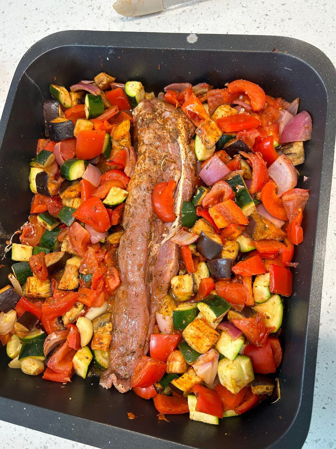 Roast uncovered in a 190c oven for 25 minutes. Take the dish out, nestle in the pork tenderloin, and season with the remaining oil, listed seasonings and s+p.