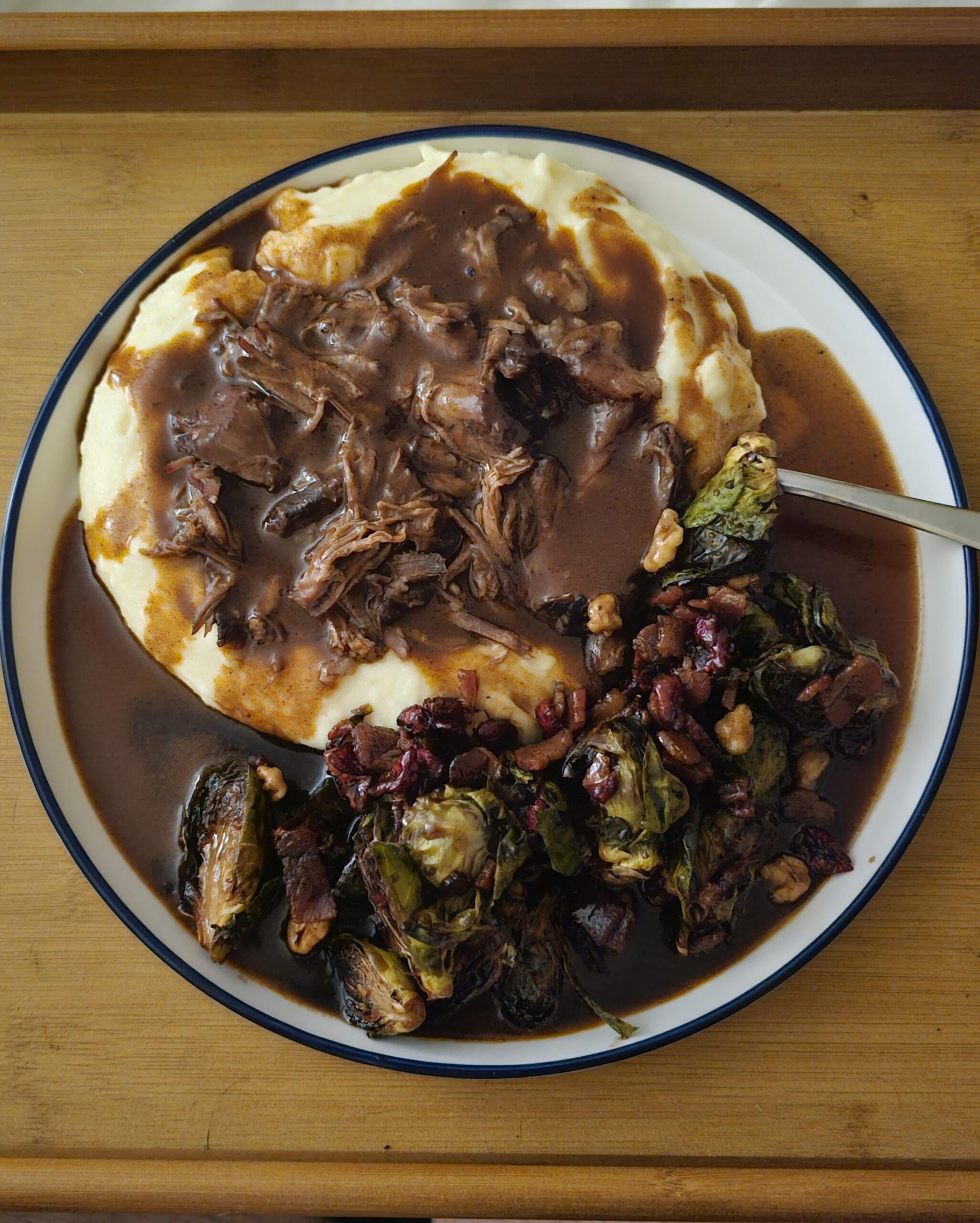 Hi! First post. Yesterday I made this plate of braised beef on some creamy mashed potatoes. A side of roasted brussel sprouts, dried cranberries, and candied walnuts all tossed in a balsamic/brown sugar glaze!