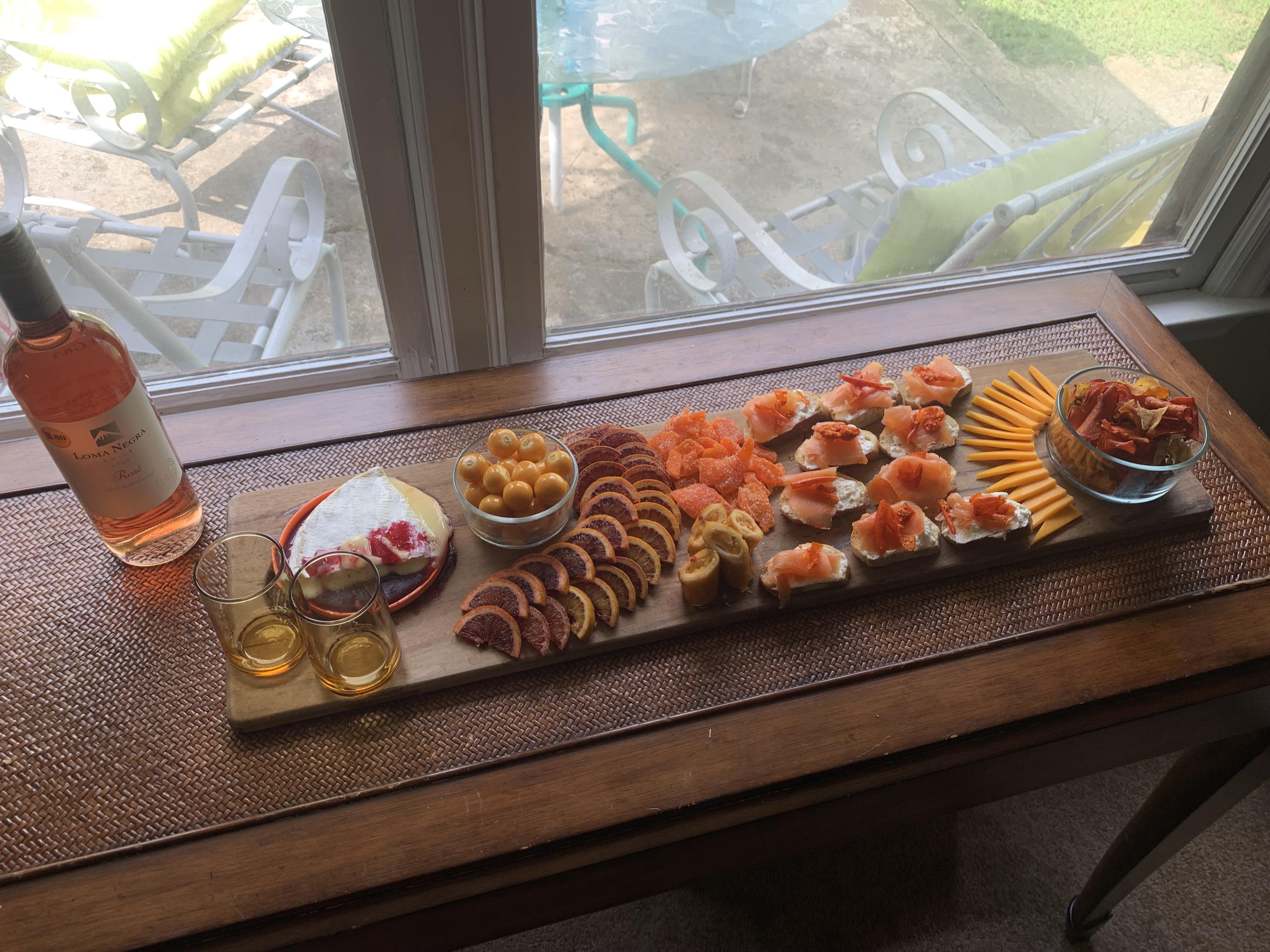 From left to right: Brie w raspberry jam, gooseberries, blood oranges, egg rolls, candied papaya (I think), smoked salmon baguettes topped with Thai chili flakes, Cheddar, sweet potato chips.