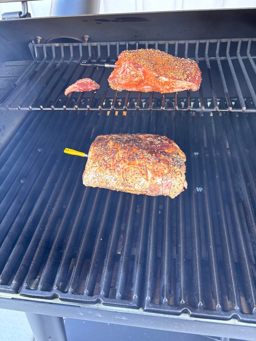 Mystery pork loin i found in the freezer with black pepper and meat church honey hot hog rub! Smoked at 130-250° till reached 120° before finishing at 500° till 145°. Also a poorly cut steak i let soak up smoke for a while before searing on a cast iron as a snack. Switched from lumberjack pellets to kirkland in the hopper and i think they didnt take very well due to the larger size but sure made lots of smoke! After emptying and mixing back with lumberjack pellets, temps stabilized, will have to experiment more but so far am happy.