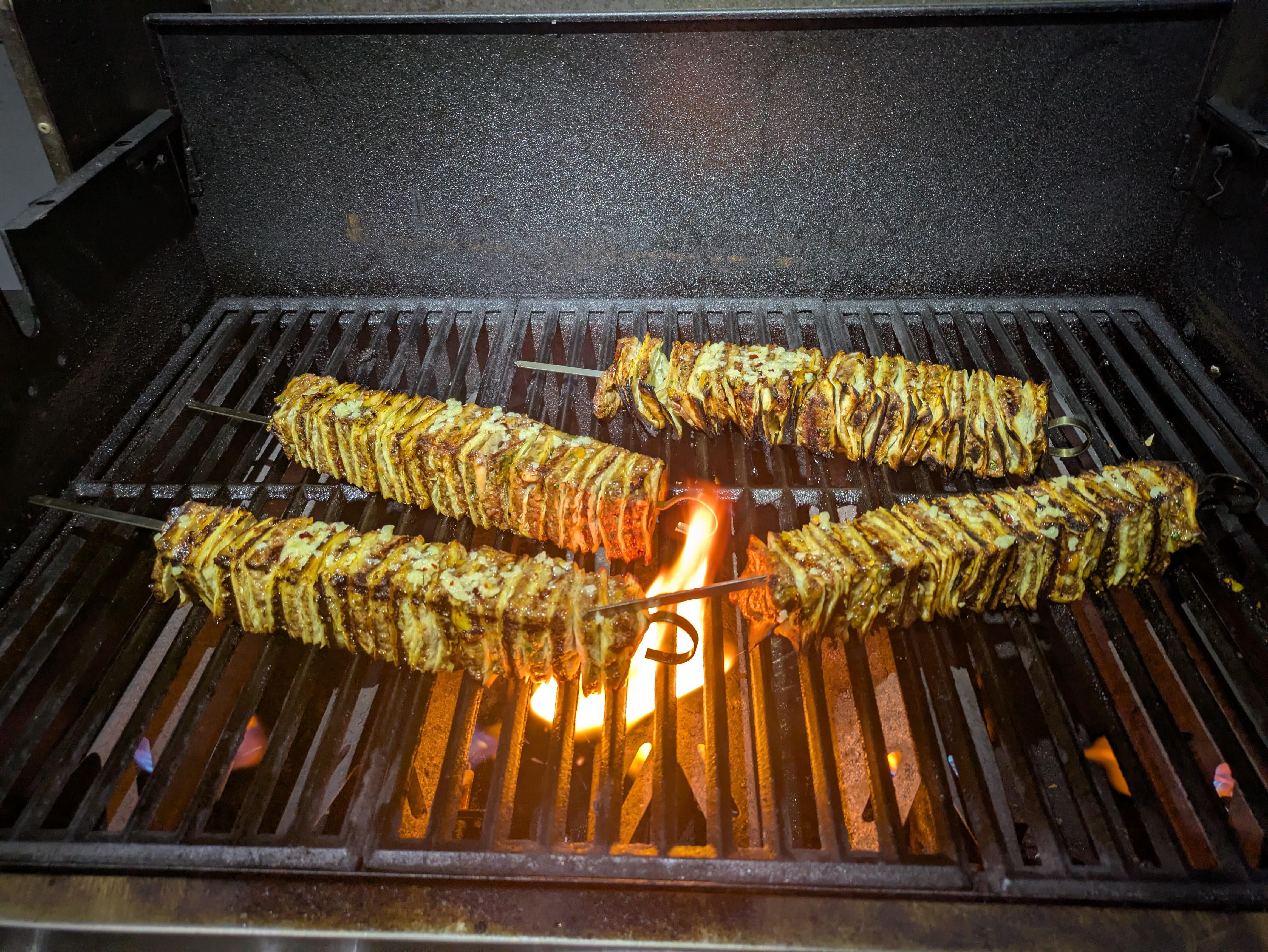 Get tortillas, get meat. I think ground meat works the best. Lay a tortilla down, put a little meat on the tortilla, pound the meat into a thin layer that covers the tortilla. Repeat numerous times, then stack your meaty tortillas. Put skewers in your meat stack, evenly spaced, then slice directly between each skewer. Now you have multiple column shaped meat and tortilla stacks. I’ve seen them grilled or thrown in the air fryer