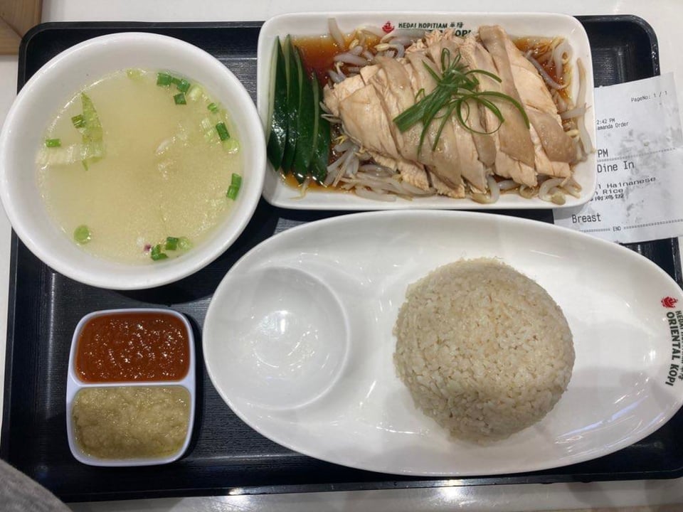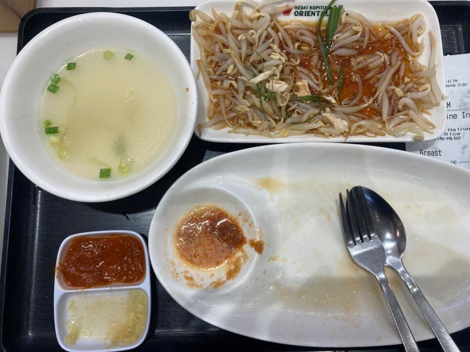 hainanese chicken rice (fragrant rice, steamed chicken breast with light soysauce, chicken broth soup i thinks, cucumber, chili and ginger) and also an eggtart !! i ate only 2/3 portion of the rice and i didn't touch the beansprouts at all lol