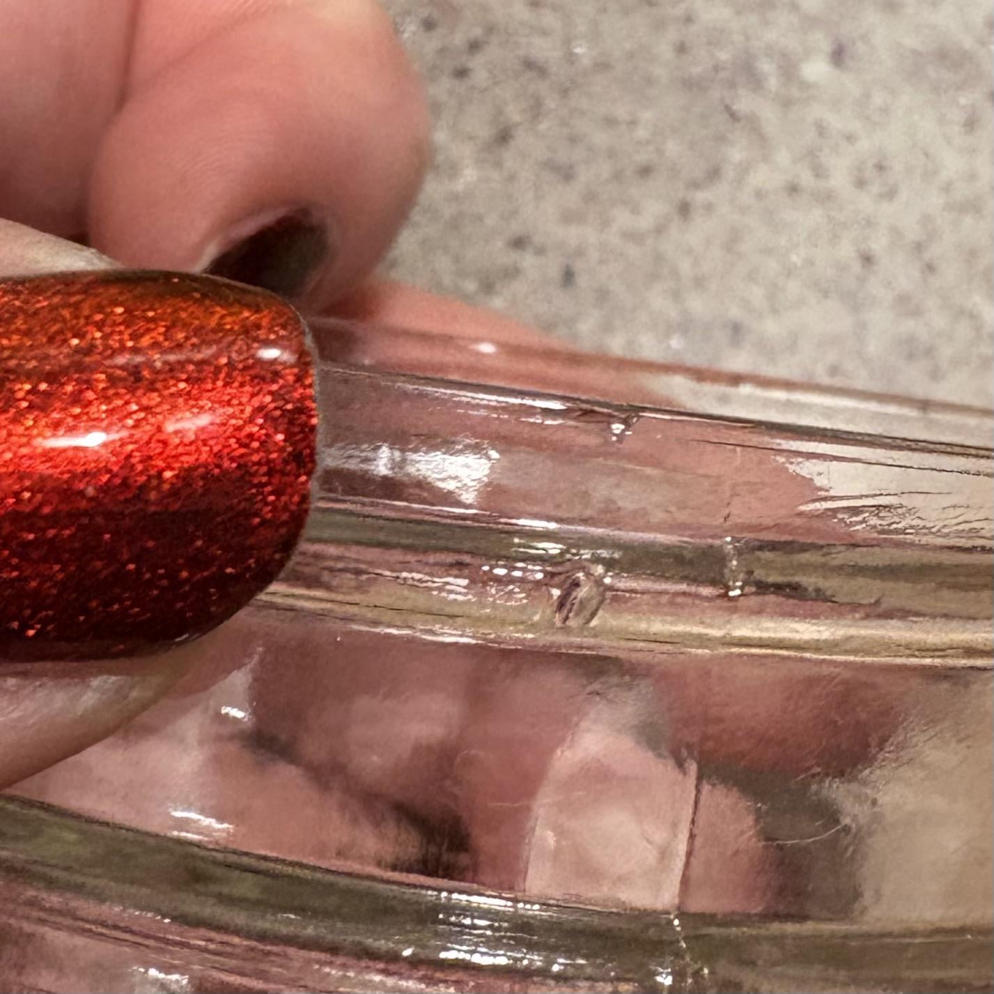One photo, an extreme closeup of a damaged edge on a Ball jar.