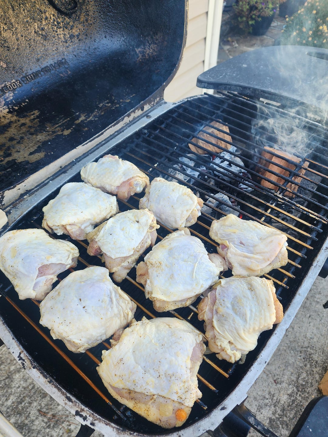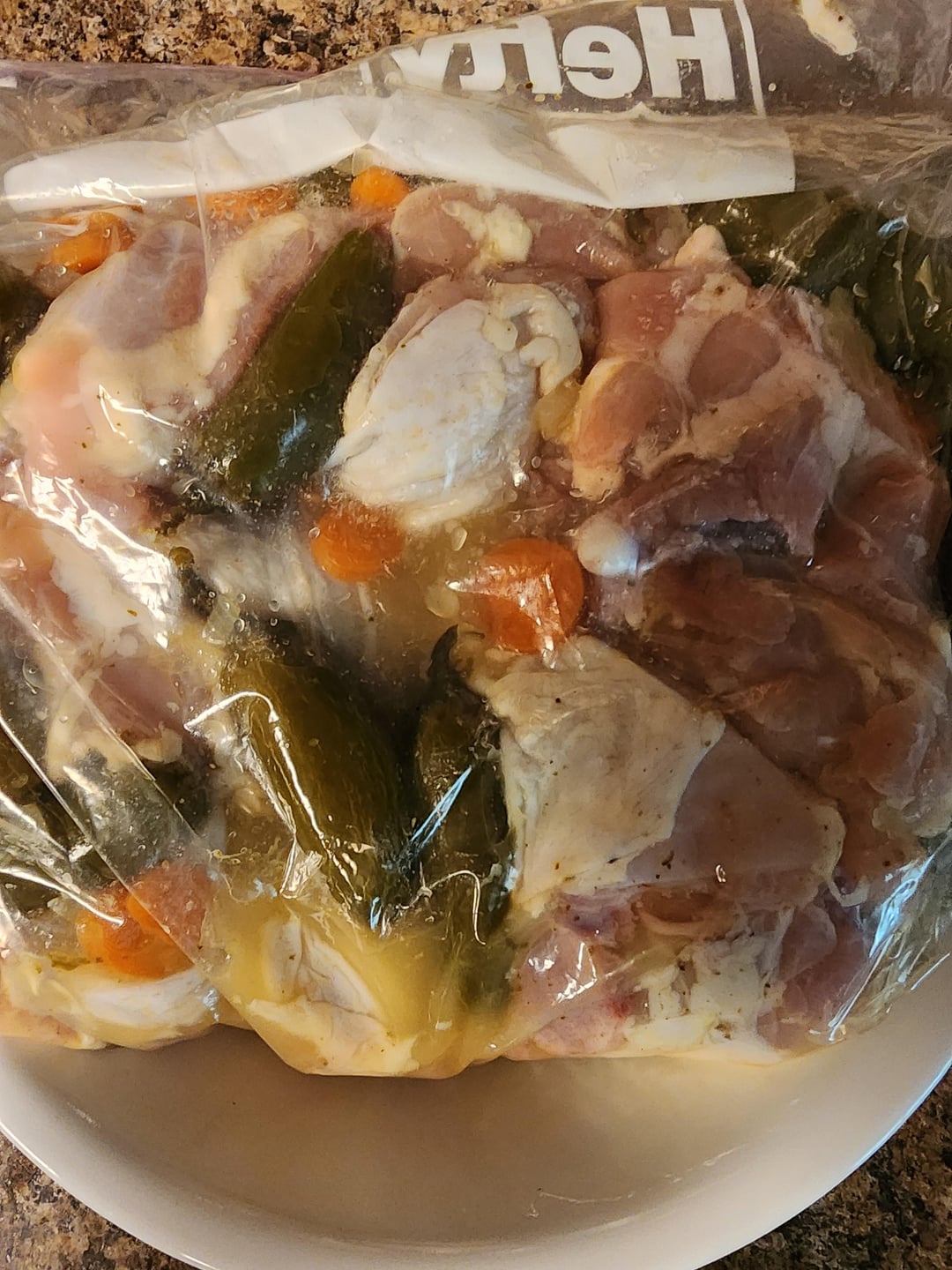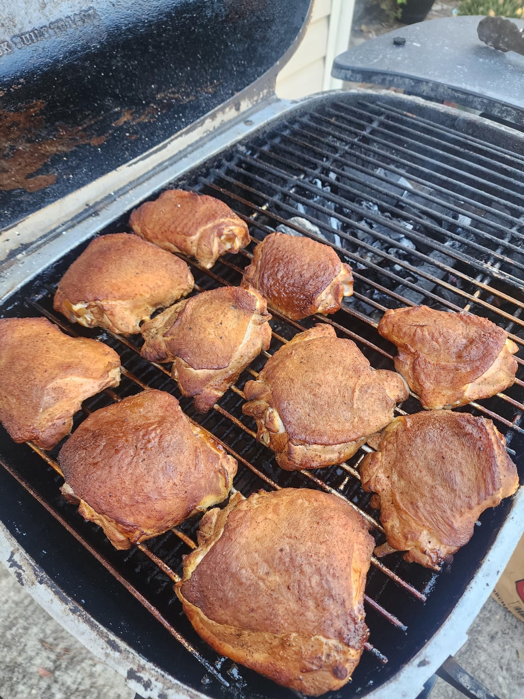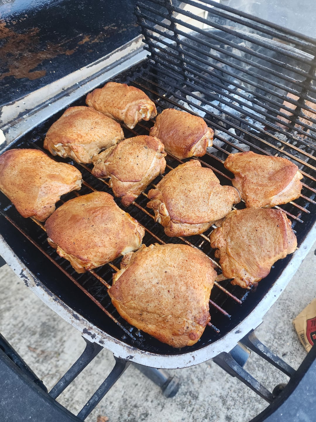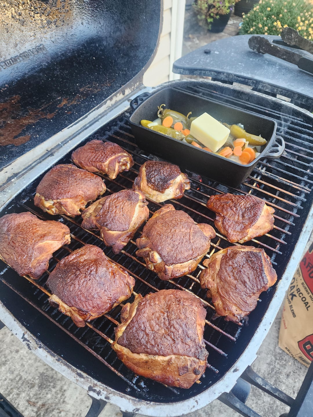 Dumped a can of whole jalapeños in a bag with a package of chicken thighs. Kept in the refrigerator for 24 hrs. Seasoned the meat with Meat Church's Blanco and the skin with Holy Gospel. Smoked at 225 till they hit 190.