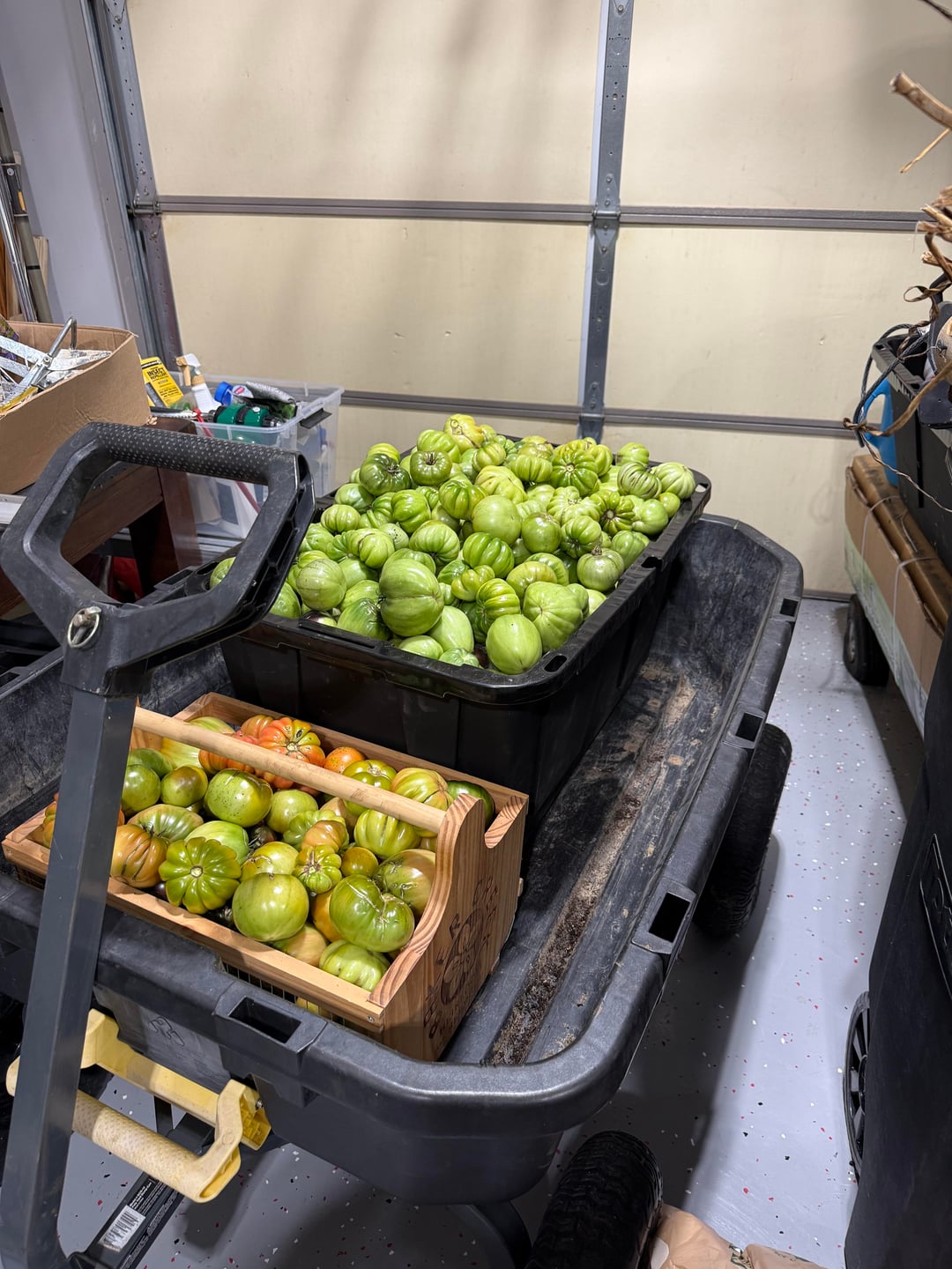 The forecast called for 29° last night so I harvested everything. I put anything blushing at all in the harvest basket, everything completely green into the black tub. I could barely lift the black tub into the wheel barrow. What do I do with the younger green tomatoes that may not ripen? For that matter, what should I do with all the greens to ripen. That may be 150#’s worth and those on the bottom must be getting squished.