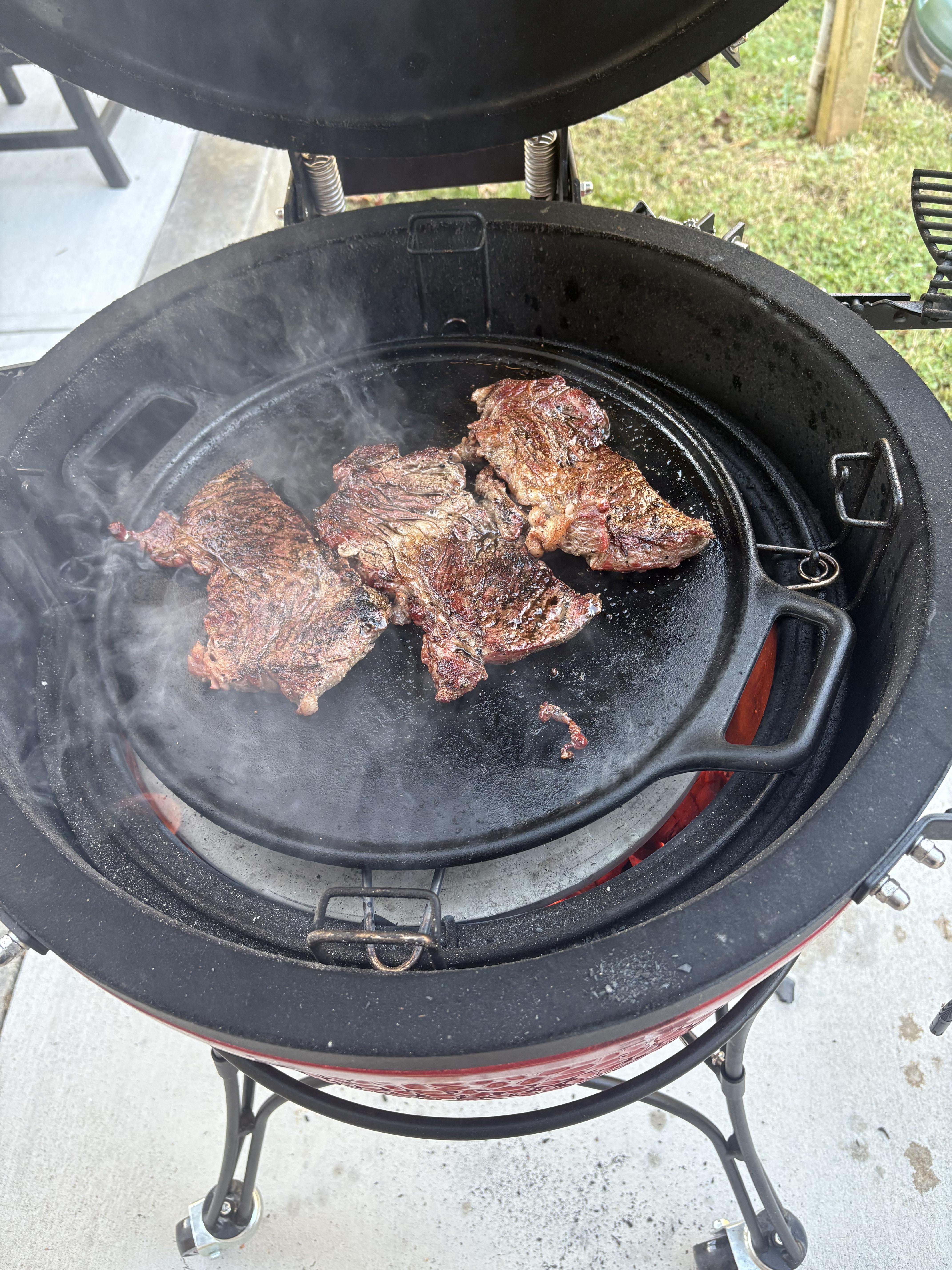 I bought a cast iron baking pan for pizzas and searing steaks. I prefer the reverse sear method, which can be a pain in the butt on the kamado, having to remove the deflectors halfway through.