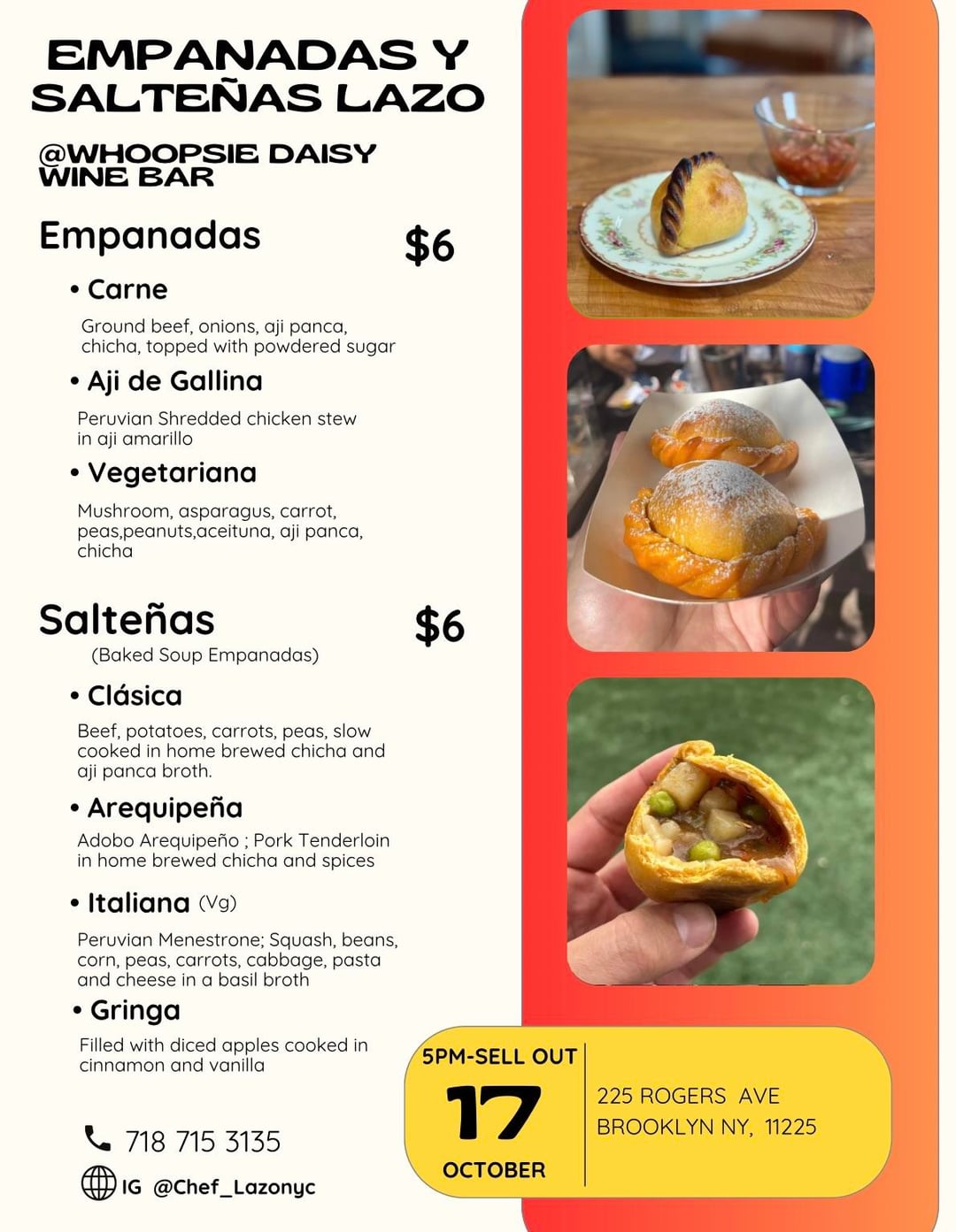 FoodNYC, On Friday 10/17 I will be at Whoopsie Daisy Bar 225 Rogers Ave Serving Peruvian Empanadas and Salteñas from the Arequipa region where my family is from. We will start at 5pm – sell out. Flyer is on the second slide.