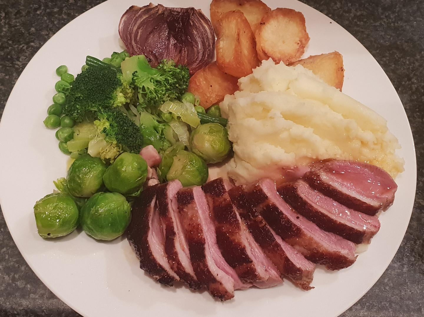 Duck breast cooked using Sous Vide, 2hrs in a water bath at exactly 54°C/130°F.