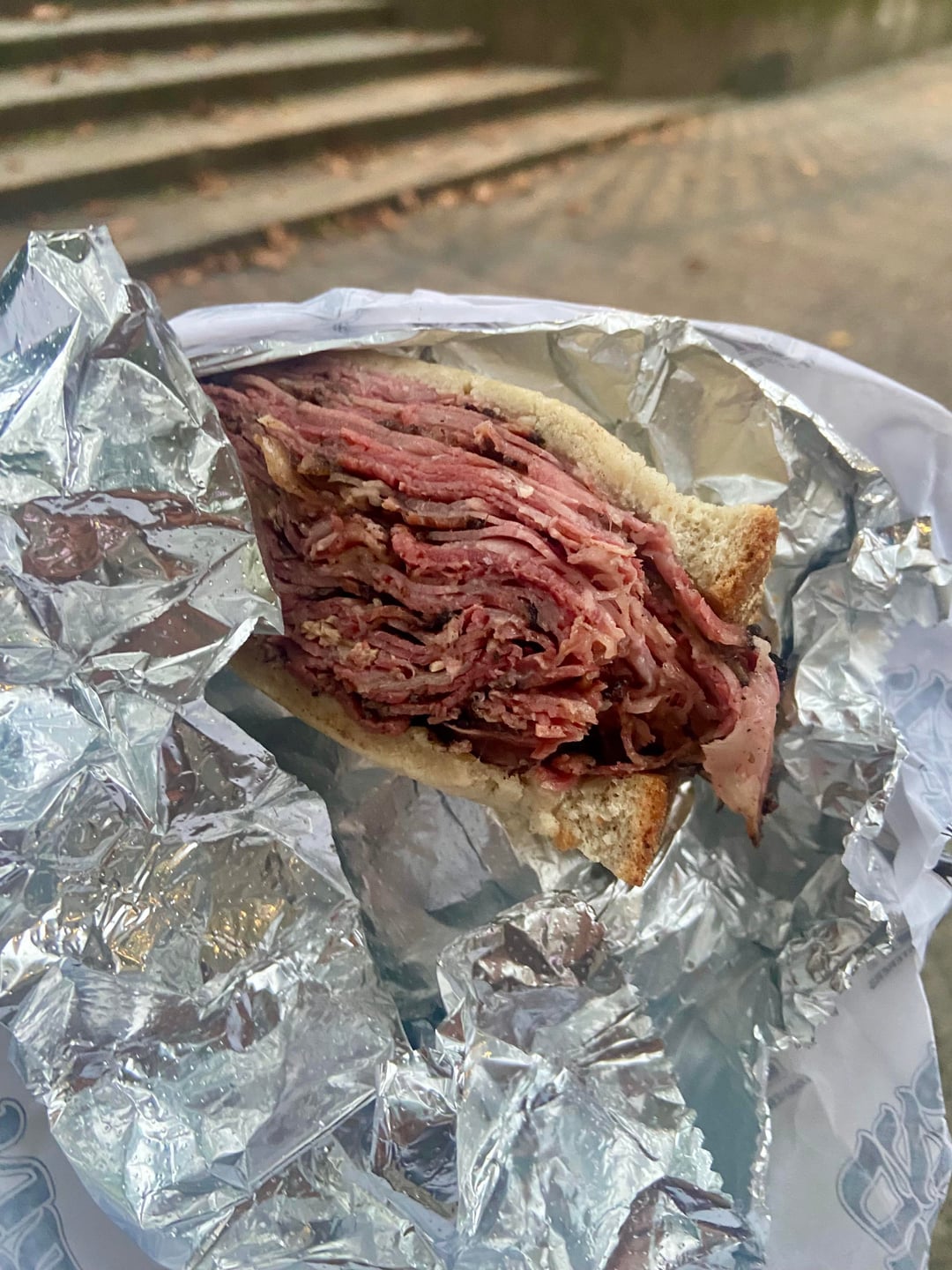 I was eager to try the food, so on my way to the train, I unwrapped the sandwich. Wow, the pastrami was so moist and had the perfect amount of fat. My only regret was that I had not bought a whole sandwich. 😜