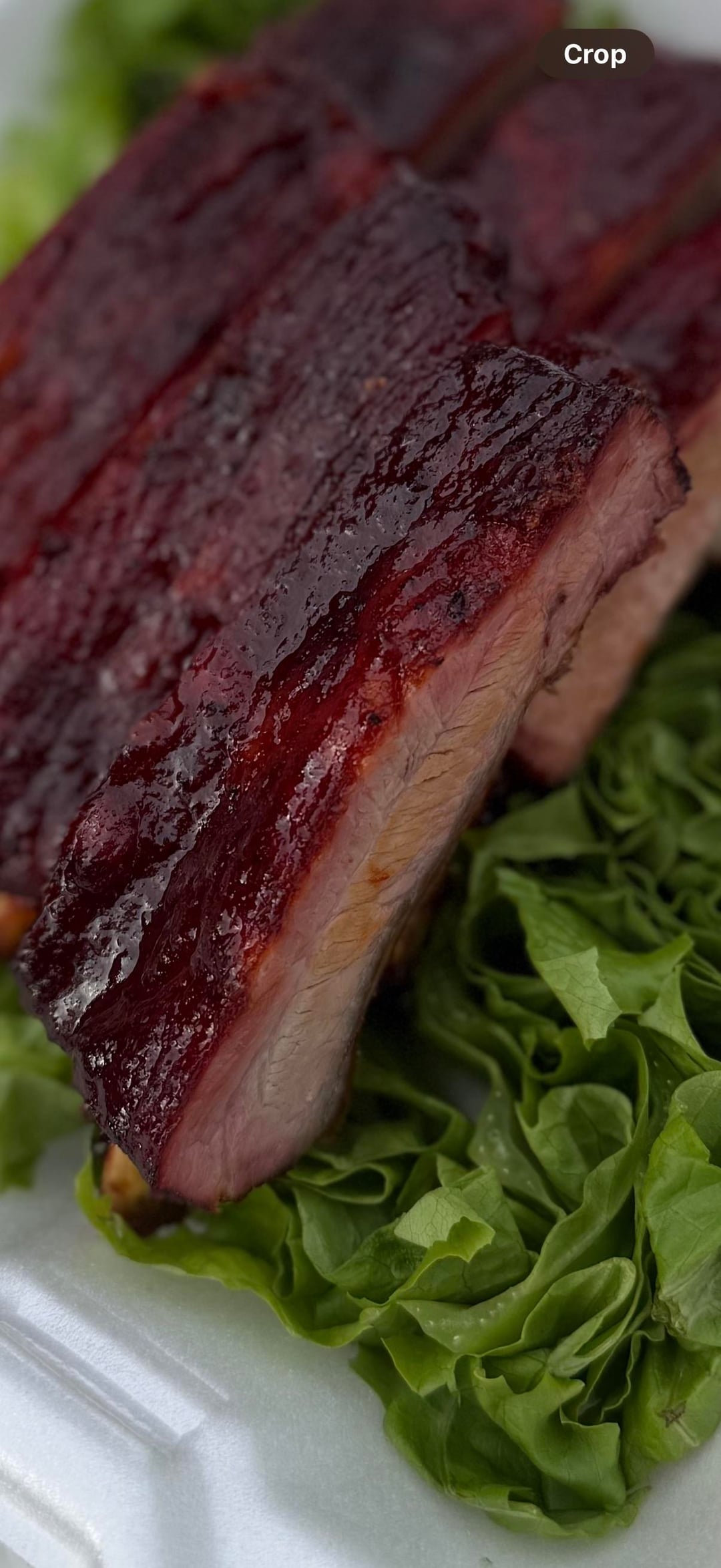 Also, if your smoke ring looked really good, take a couple and put them on their sides so you can see it. For this box, with all the extra garnish space, I would have put one rib on each side of the stack with the sides exposed showing the smoke ring. A little spray of “Duck Fat” on each one would give them a shiny finish.