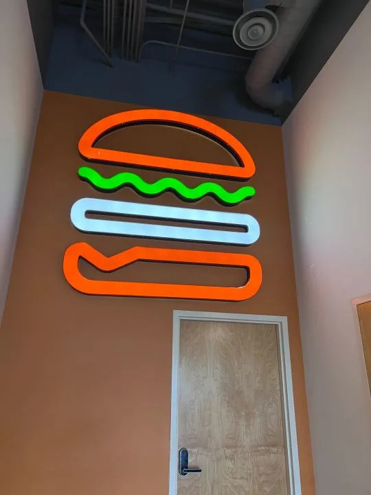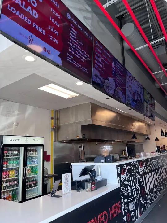 Both spots have decor that corresponds to either side. Urban Gyros has a black, white, and red decor, and Slap Burger has an orange decor.