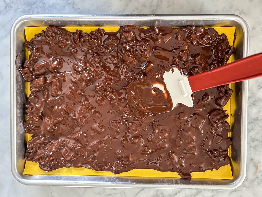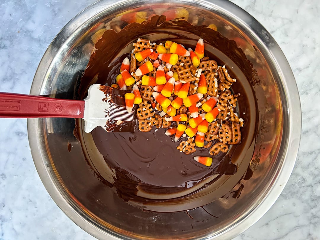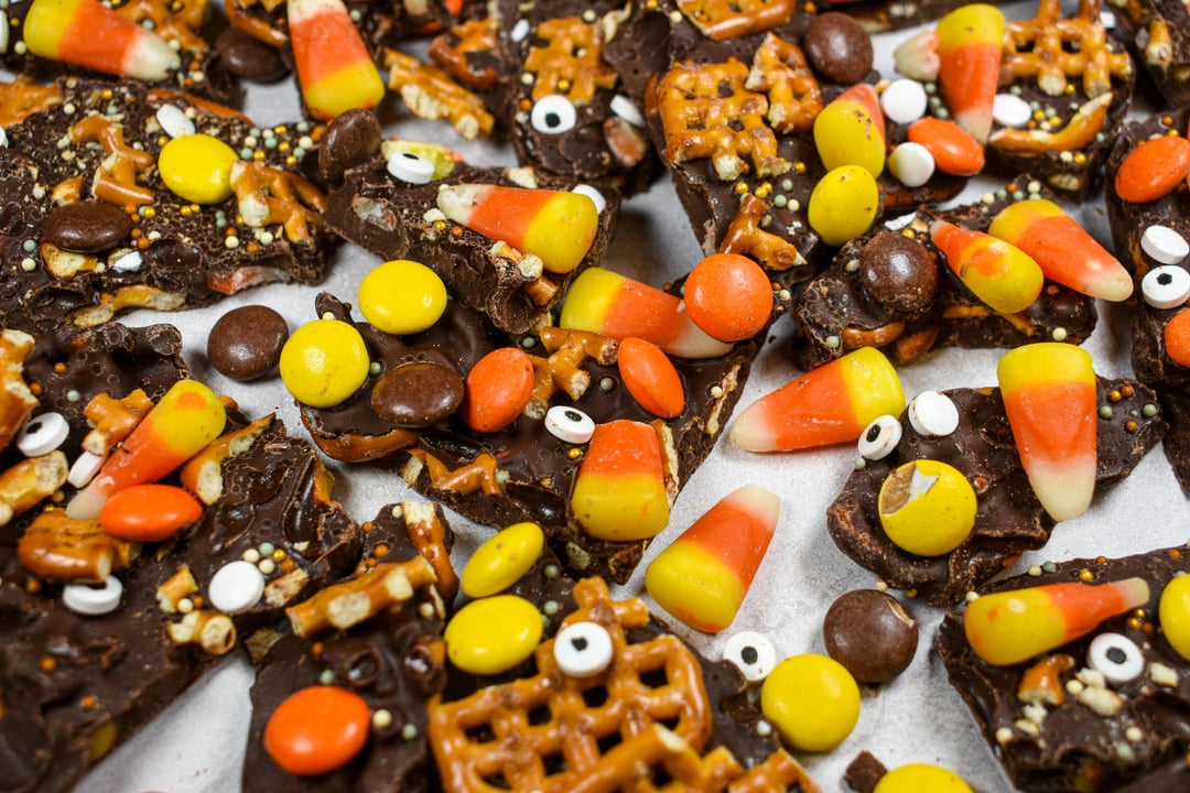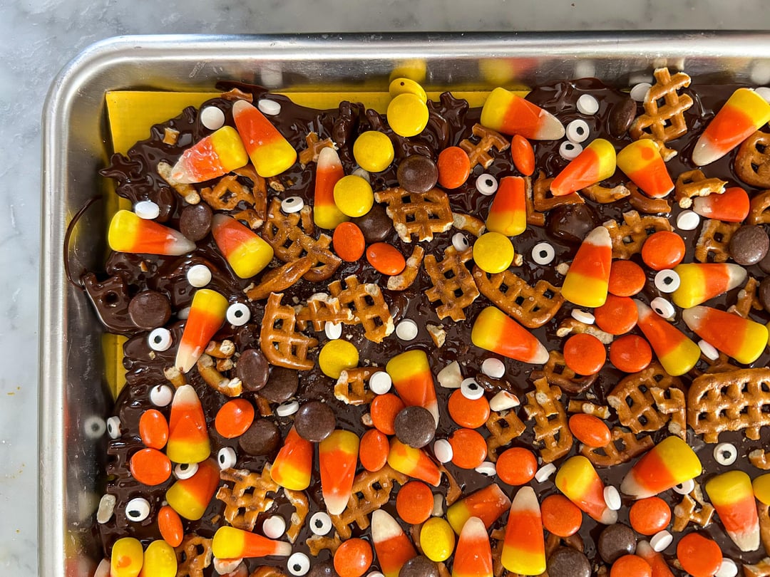 Halloween candy bark made with melted dark chocolate, candy corn, Reese’s Pieces, and cute Halloween "eyeball" sprinkles.