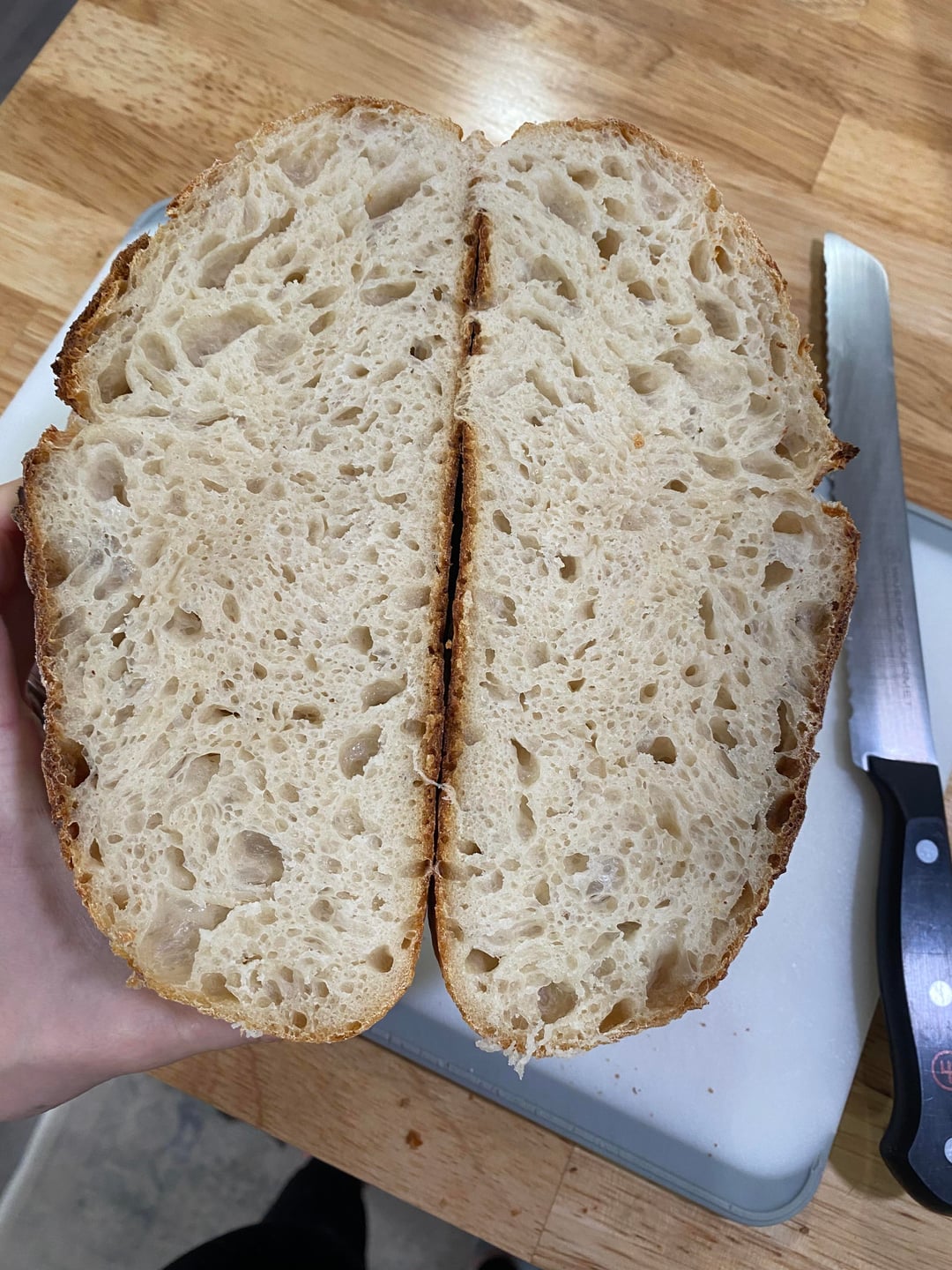 For this loaf, bulk ferment in oven with light for 6 hours, then shaped and cold proofed for three days in fridge. Then baked 500 F preheated Dutch oven for 20 min, lid removed and baked for additional 25 min at 475 F. Cooled for three hours before cutting into.