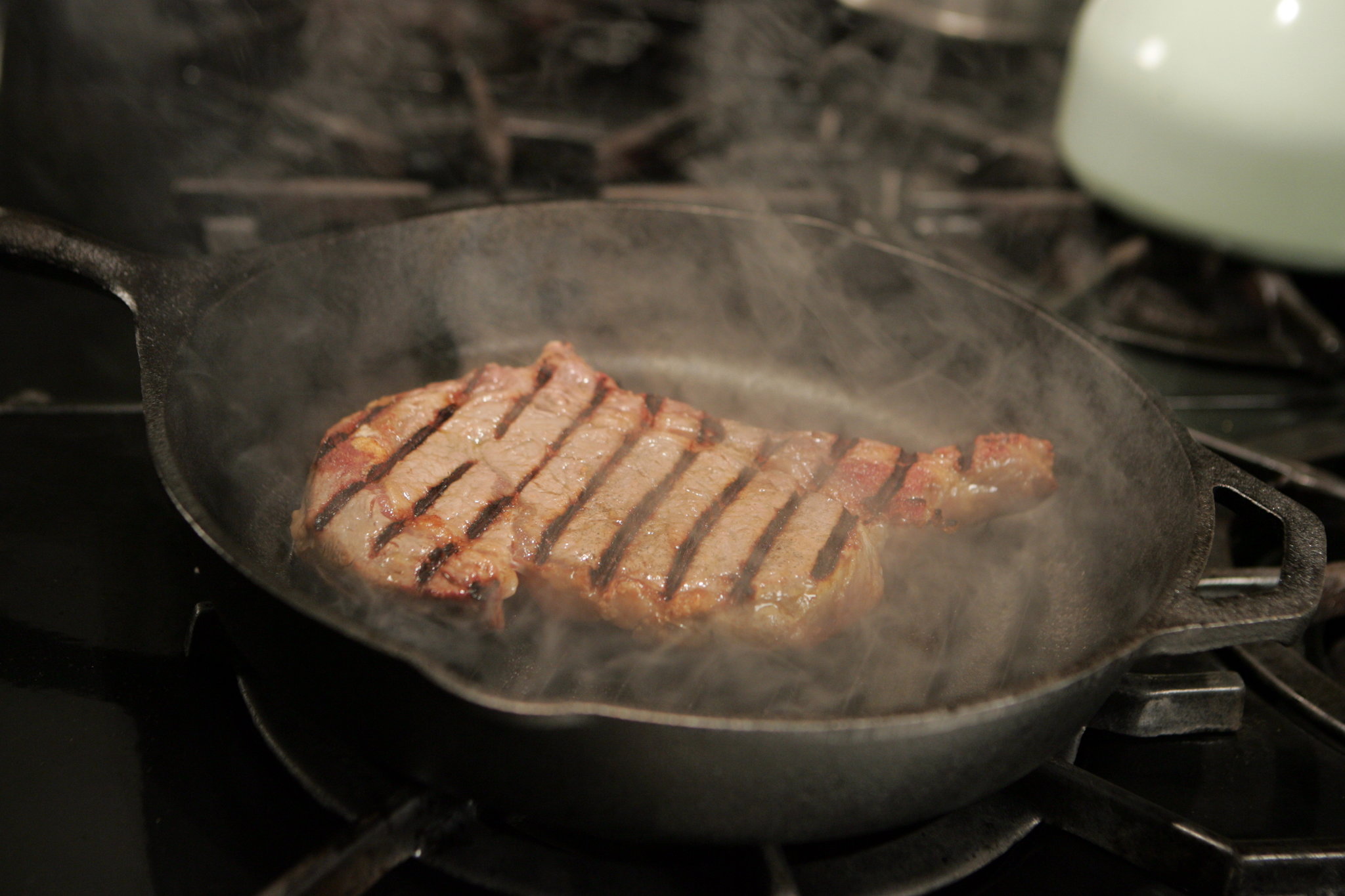2. Heat oven to 500 degrees (550 if possible), and set a rack in the lowest position, unless skillet can be placed directly on oven floor. Place a cast-iron skillet large enough to hold steaks without crowding over high heat, and heat until smoking. Sprinkle surface of pan with coarse salt, and put steaks in. Smoke will billow up; wearing a thick oven mitt, immediately transfer skillet to oven.