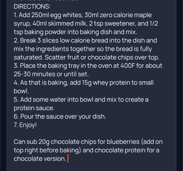 VERY FILLING!! Very customizable – the base is a lot of protein, and I normally add 3-5 ounces of blueberries/raspberries (lots of fiber) or .5-1 ounce mini chocolate chips on top before baking.