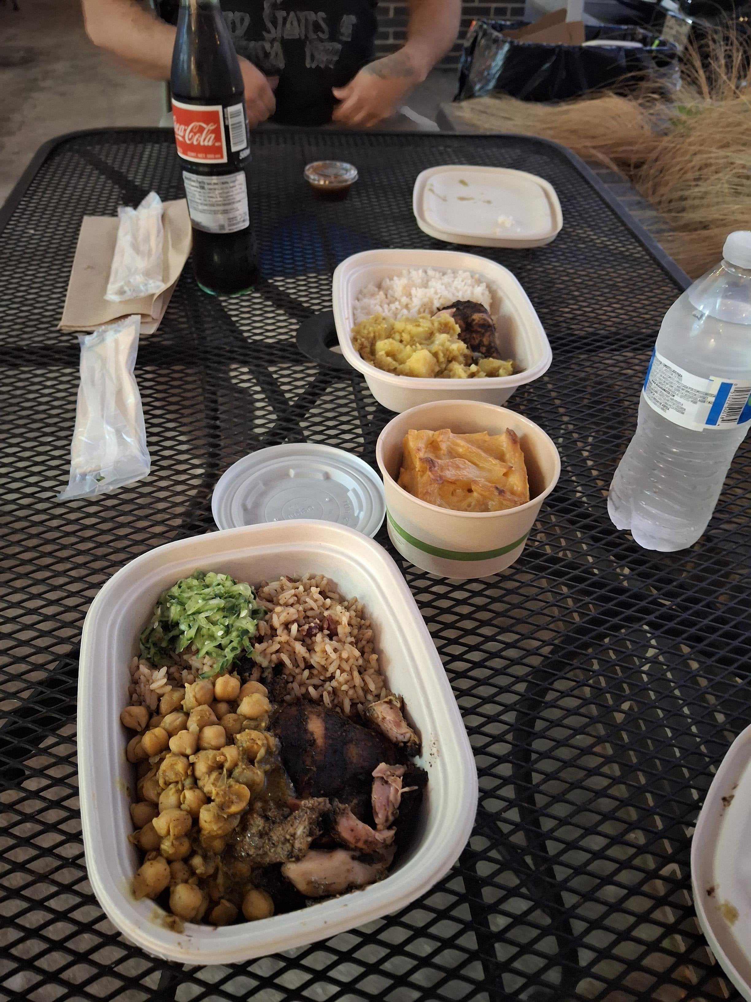 We grabbed 2 jerk chicken bowls, with 3 sides of Plantains, Aloo Pie with chickpeas and hot sauce and macaroni pie. All in all, it came out to ~$55.