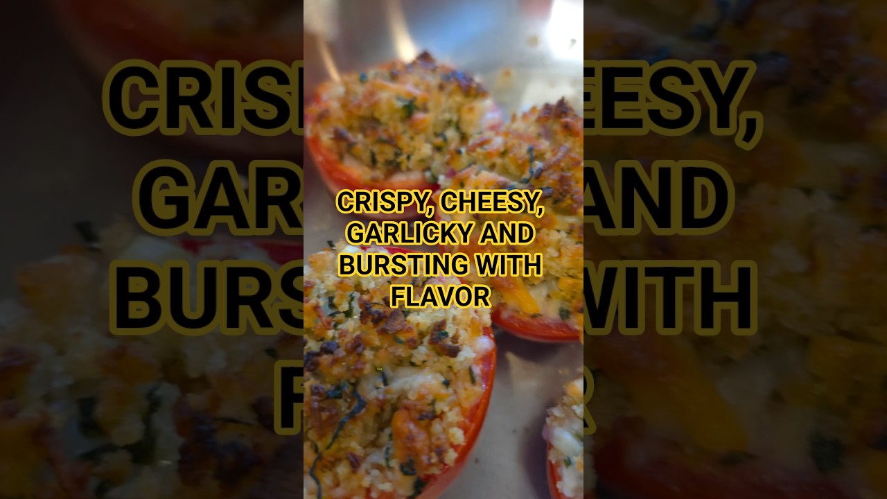 Let’s make my favorite Italian stuffed tomatoes. Start by adding some olive oil and butter to a skillet. Melt the butter and bring it up to temperature. Add finely diced red onions, minced garlic, chopped spinach, and fresh parsley. Sauté until the onions turn translucent. Now add your Italian panko breadrumbs and toast until golden brown and crispy. Pour in a few ounces of white wine and let it cook down for a couple minutes. Cut the ends off your tomatoes. Slice them in half and scoop out the centers to make perfect little cups. Remove your breadcrumb mixture from the heat. Stir in some Italian blend cheese and stuff each tomato half generously. Place them in a baking dish with a splash of white wine, a springrig of rosemary, and a little thyme. Bake in a preheated 375° oven for 15 to 20 minutes until the tomatoes are tender, the cheese is melted, and everything is golden brown. Finish with a drizzle of balsamic glaze and some fresh grated Parmesan. These Italian stuffed tomatoes are buttery, herby, and absolutely irresistible.