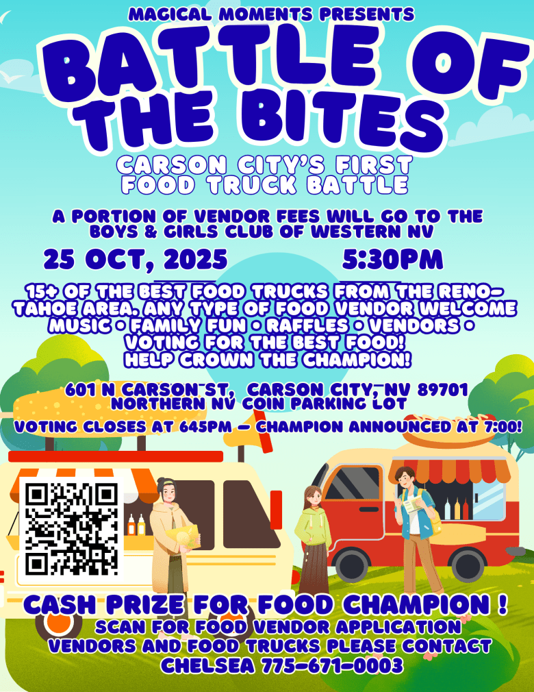 The public can enjoy live music, raffles, vendors, family-friendly activities, and most importantly, cast their votes for the best food of the night. Voting closes at 6:45 p.m., with the Food Champion announced at 7 p.m. The winning food truck will take home a cash prize and the title of Carson City’s first Battle of the Bites Champion.