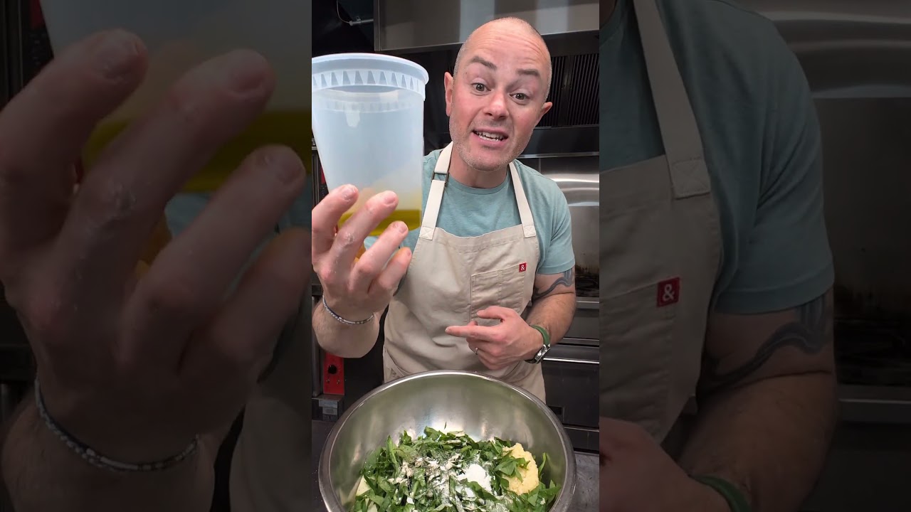Hey, I know you like creamy spinach dip and you’re not going to believe how easy this one is. Just please let it cool off. First, we’re going to rough chop some spinach. And when I say rough chop, you can really grab a handful and push it into the shape that you want. Pick up your knife. And once I get to a certain point, I’ll sort of re-roll the spinach and recompact it down. I’m going to tightly pack this cork container. And this is going to be my measuring cup. But then I’m going to take one zucchini. We’re going to trim this end off. Split this down the middle, but leaving the stem end intact. and thinly slice it into a mixing bowl. Add our baby spinach. One whole head of garlic that I have minced. Four chives that I’ve cut into oneinch sticks. About a half a teaspoon of onion powder. This is just going to jump up the savoriness of this whole entire dip. Two good pinches of kosher salt. A pinch of black pepper. A tablespoon of cornstarch. Then before we add a whole bunch of cheese, I’m going to drizzle a little bit of olive oil. It’s maybe a tablespoon, but it’s just enough so I can disperse my minced garlic. You want to evenly coat everything in the cornstarch also. Then this is about a pound of cheese. And this is Swiss Parmesan and mozzarella cheese, but you can use any of your favorite cheeses. And I’ll get this whole mixture into a 10-in pan. And you can mound your pan up pretty good. It’s going to shrink down. Just make sure this whole thing can go into the oven. Then we’re going to give a couple gugs of heavy cream. And because we put cornstarch in here, it’s going to thicken the cream and the cheese and give us this ooey gooey dip. We’re going to go into a 375°ree oven for about 20 to 30 minutes. I know it’s tempting, but please let this cool and follow me because this dip is gluten-free, but the ficasha is