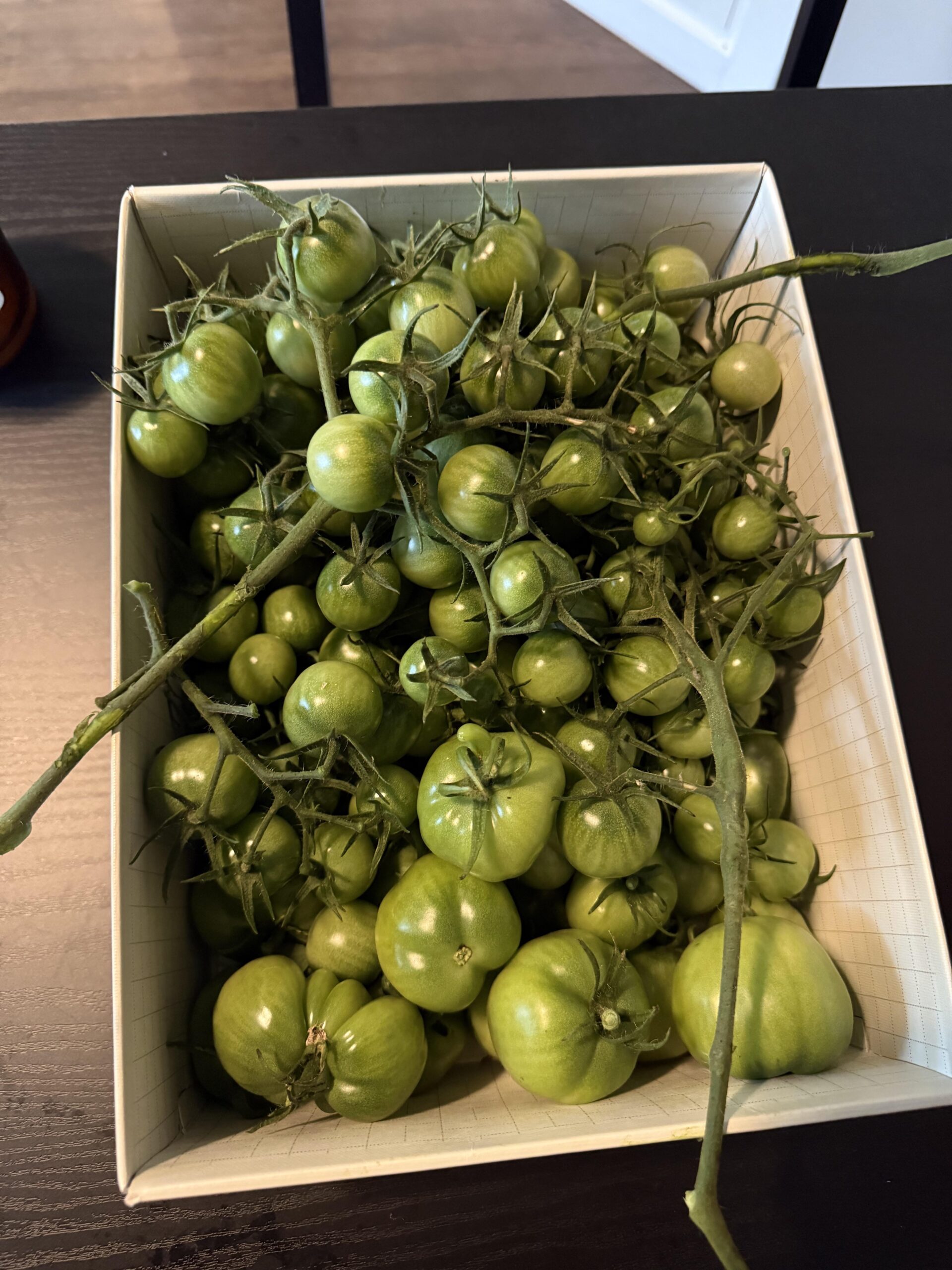 We just ripened 30 pounds of green tomatoes, leave everything as is on the vine and put that in a couple of brown paper bags with a banana, then lightly close the top of the bag so light isn’t getting in but there’s plenty of air