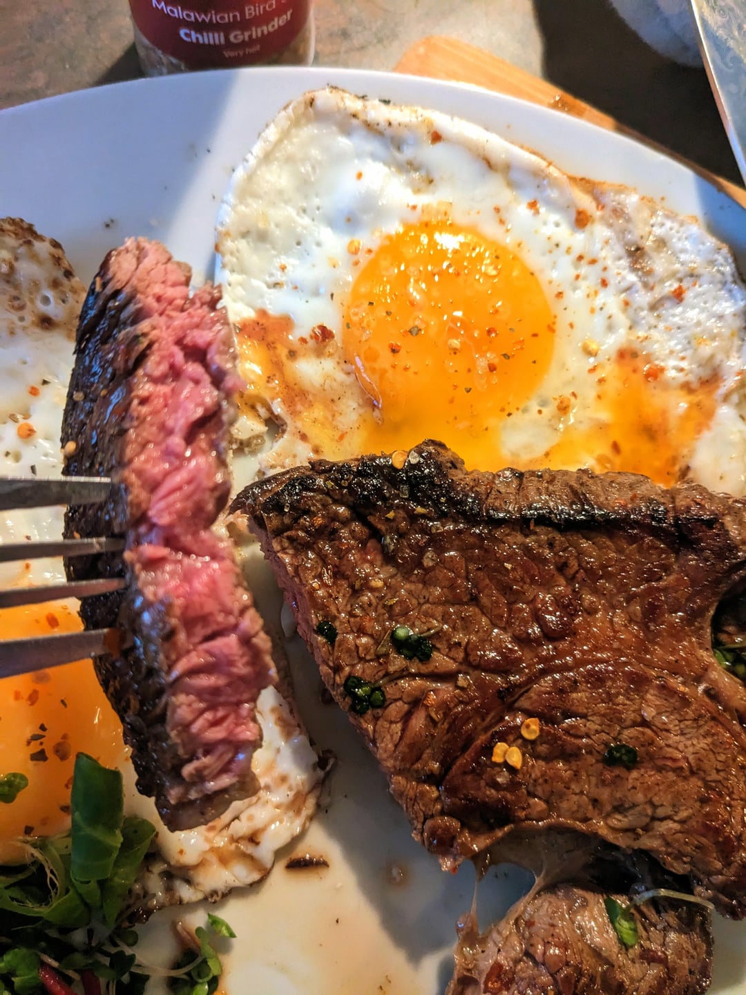 I love me some steak and runny eggs. A little butter toast on the side for me but otherwise looks perfect.