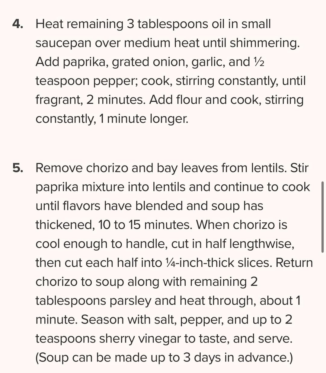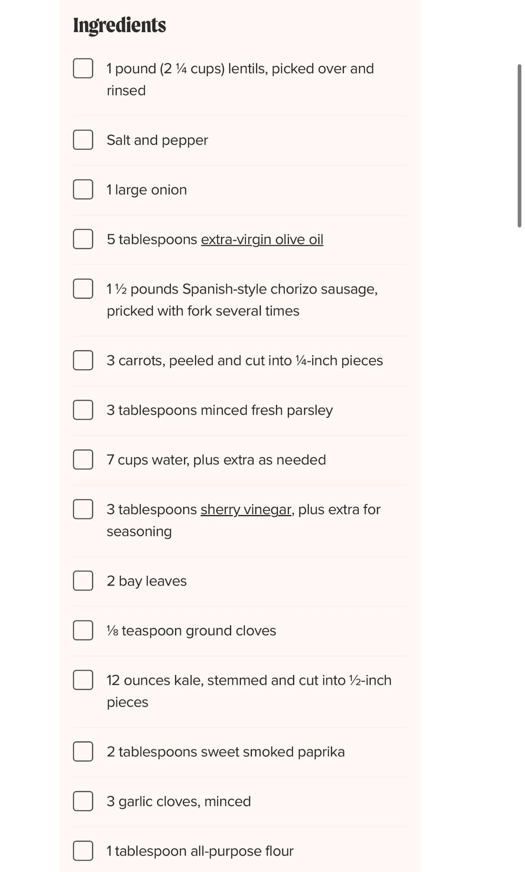 I omitted the flour, and actually ditched the entire step of creating a roux at the end. Instead, I added all those ingredients are the start of cooking (besides the flour). I also only introduced the chorizo when I added the kale toward the end of the recipe. I used Trader Joe’s vegan kale, which I think is a good product.